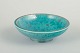 Skål i klassisk turkis glasur med indlagte sølvdekorationer, typisk for Kåges ikoniske Argenta-arbejder for Gustavsberg. Elegant lille form med sølvrand og dekorerede blomsterdetaljer.