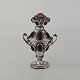 Hovedvandsæg i sølv dekoreret med forskellige smykkesten og en fugl på toppen