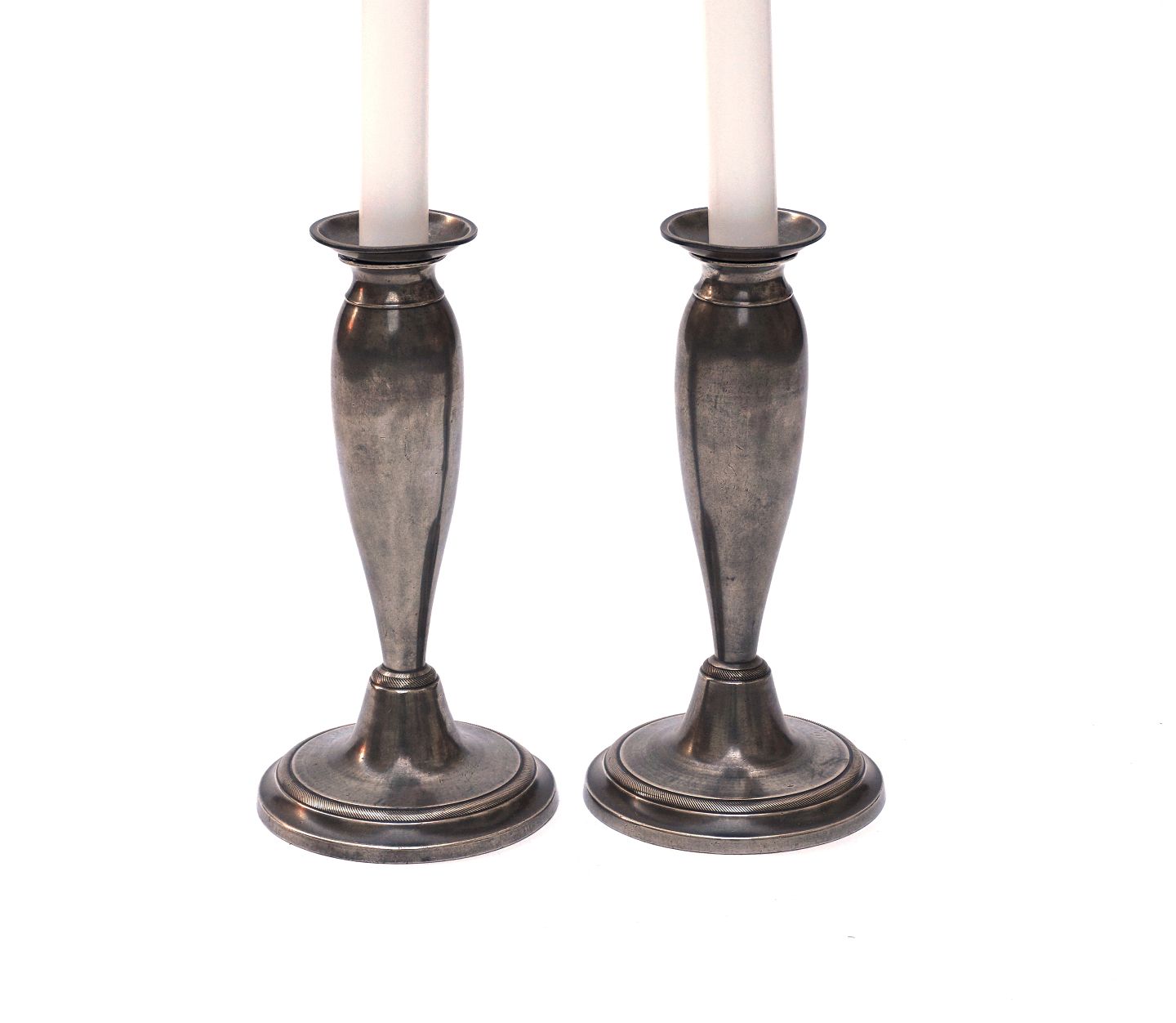 A pair of tulip shaped tin candle holders, around 1840