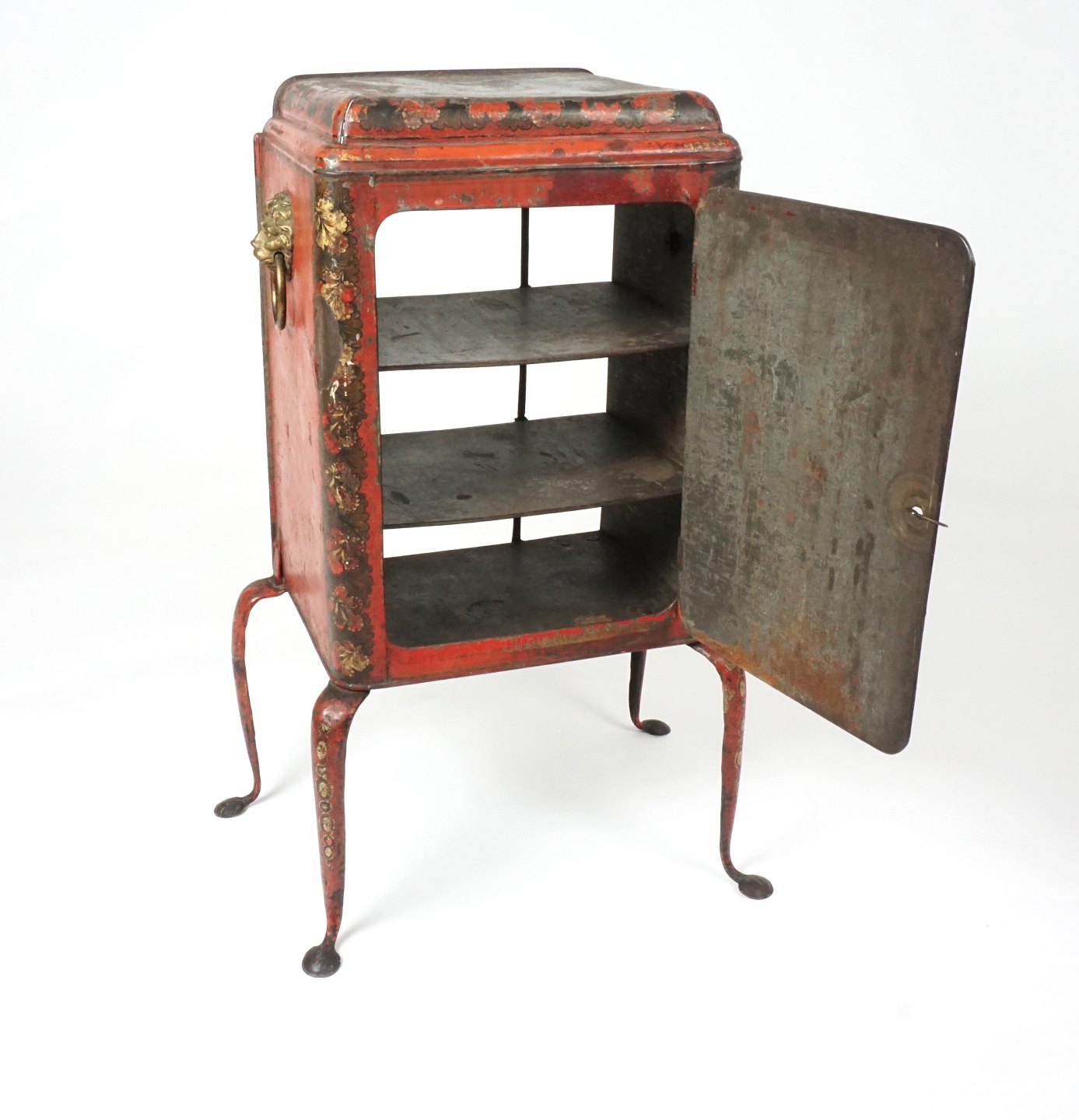 Small origninal decorated cabinet, metal with gildings Northern Europe around 1840 H: 69cm. W: 34cm. D: 26cm Item number: 23620
