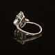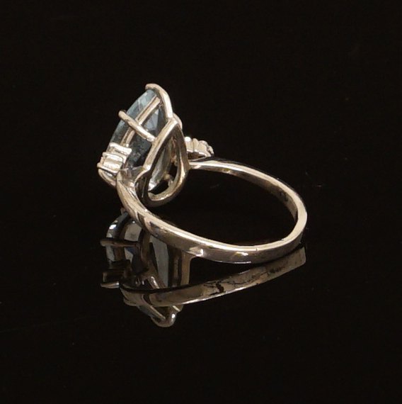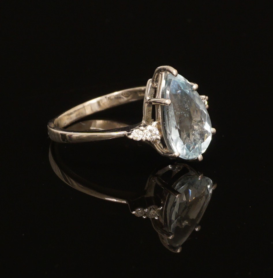 18kt hvidguld ring med akvamarin flankeret af fire diamanter. Ringstr. 56