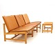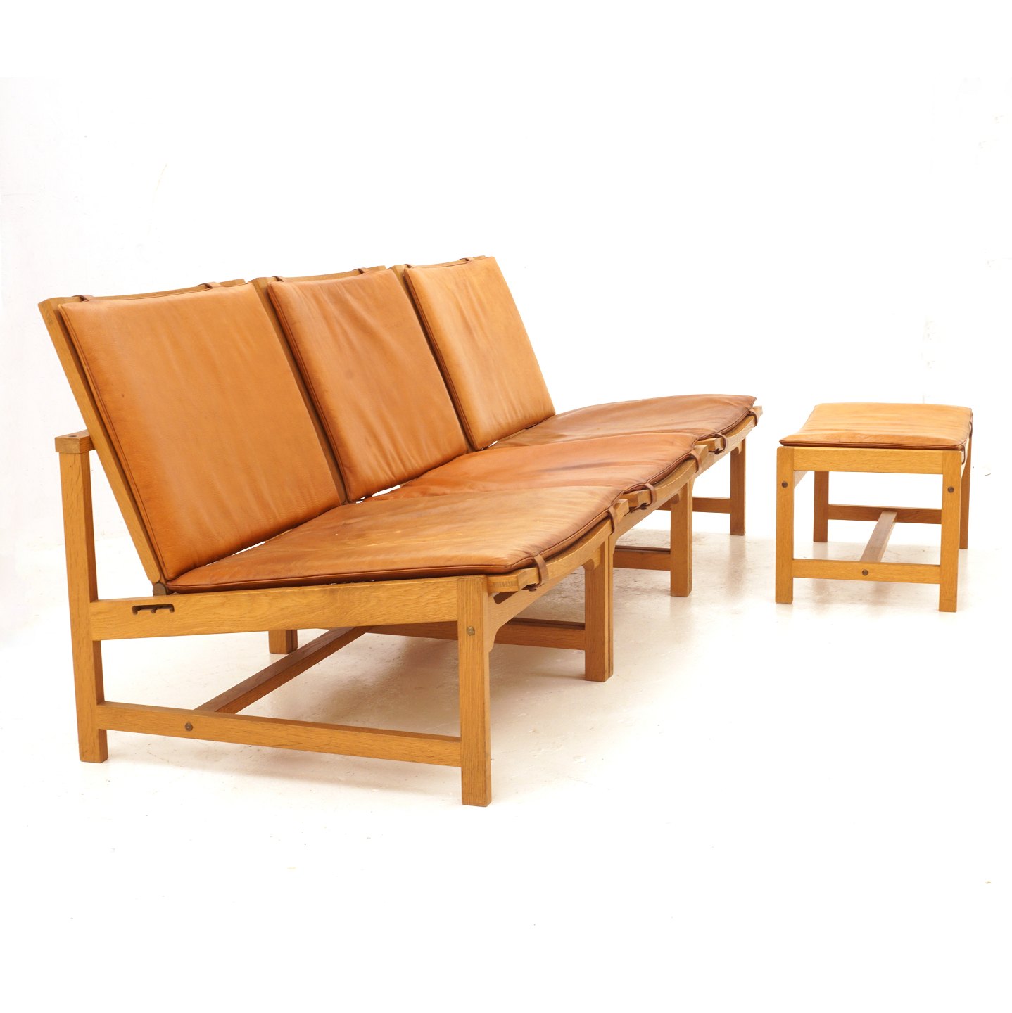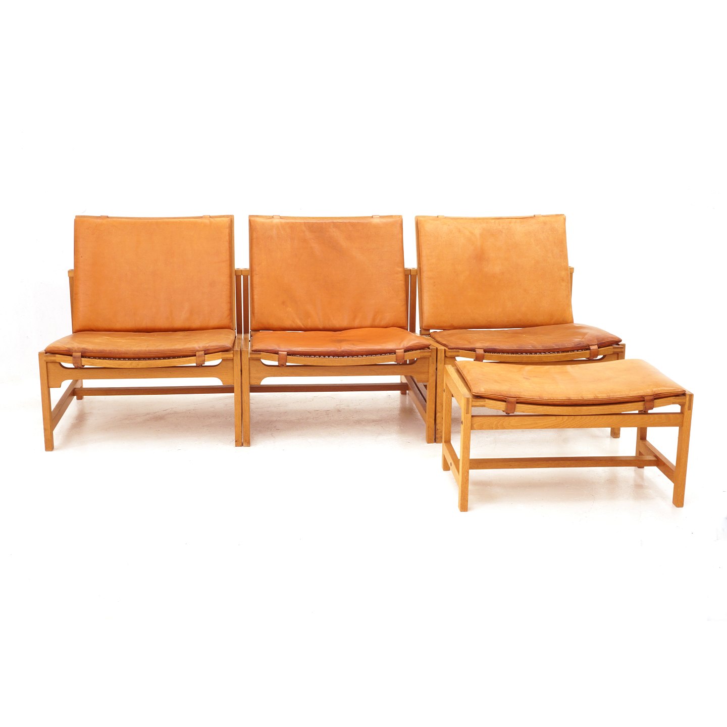 Arne Karlsen & Peter Hjort: Set of 3 lounge chairs and 1 stool, oak with leather. Danish Design. Presented in Milano 1961. L: 180cm. D: 70cm. Hs: 30cm. H: 66cm