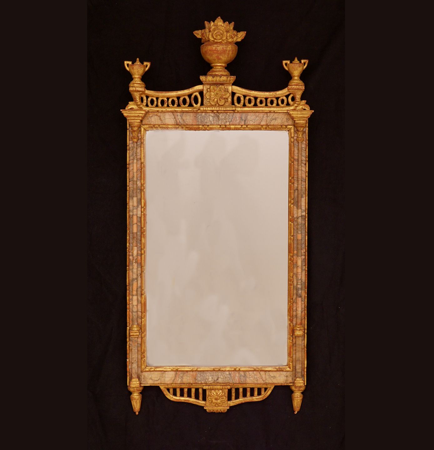 Spejl i forgyldt ramme prydet med alabast. Altona ca. år 1780. Mål: 91x43cm
