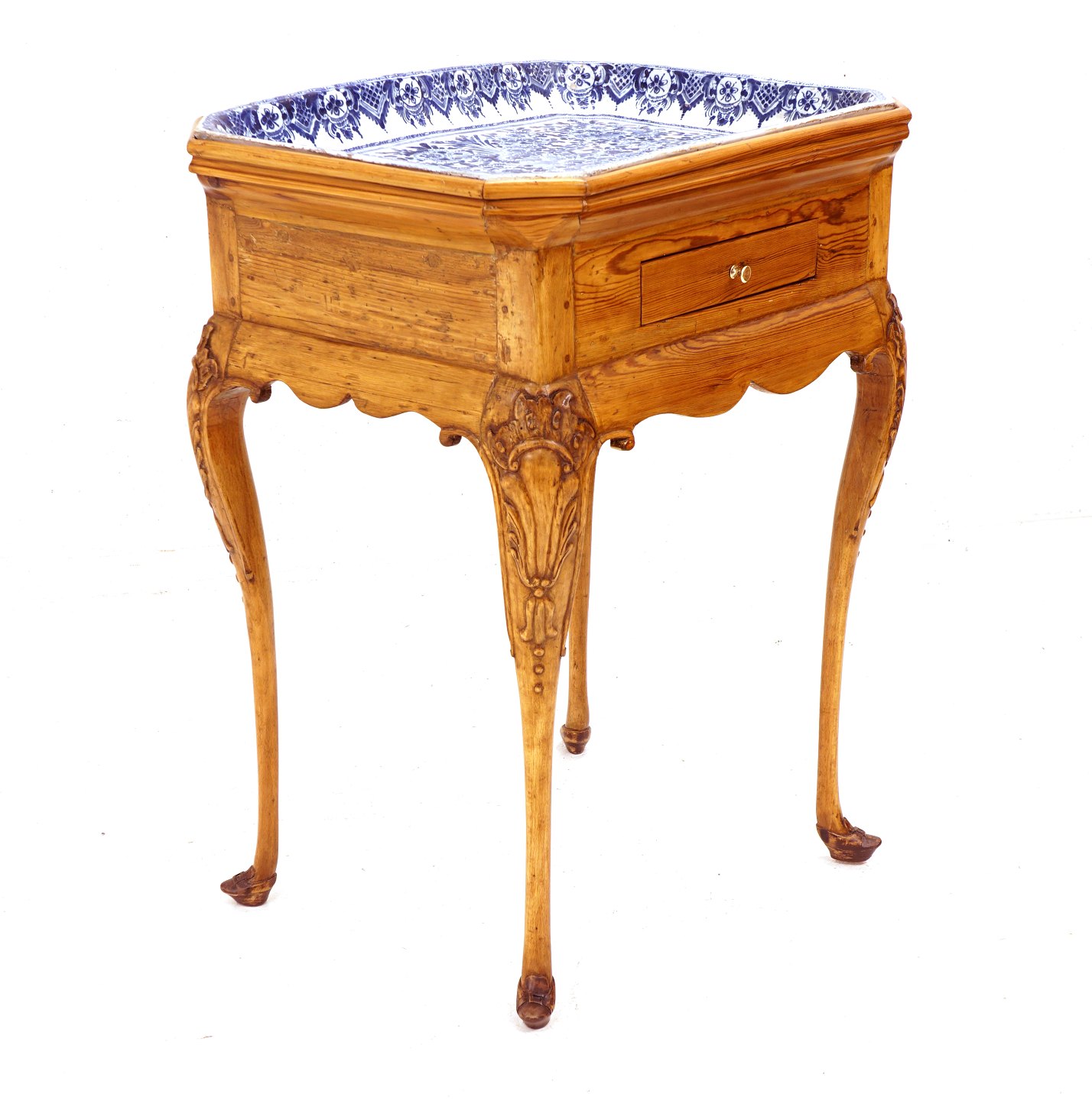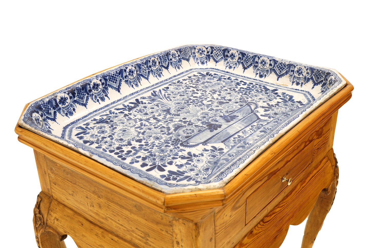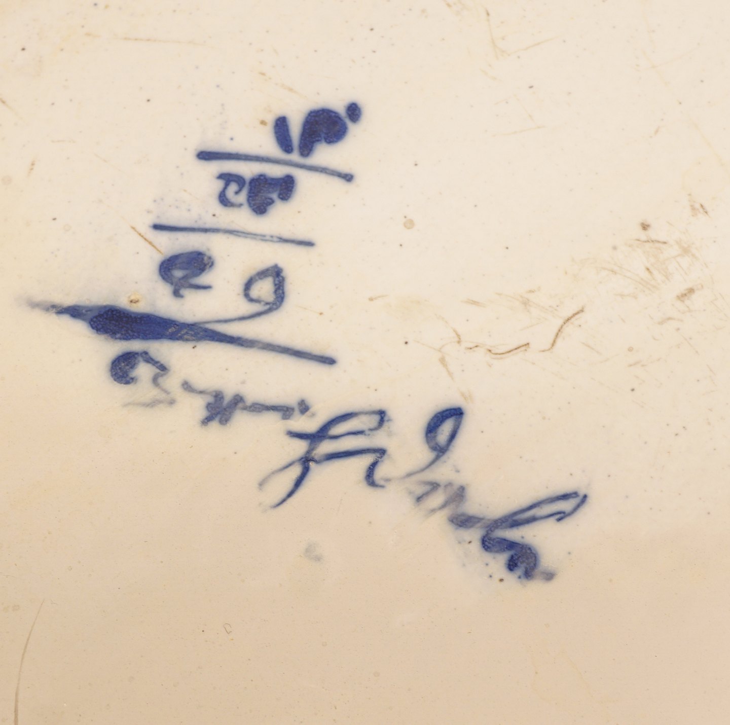 St. Kongensgade fajancebord. Blådekoreret plade med stiliserede blomster. Signeret Johan Pfau. København ca. år 1740. H: 74cm. Plade: 58x44cm