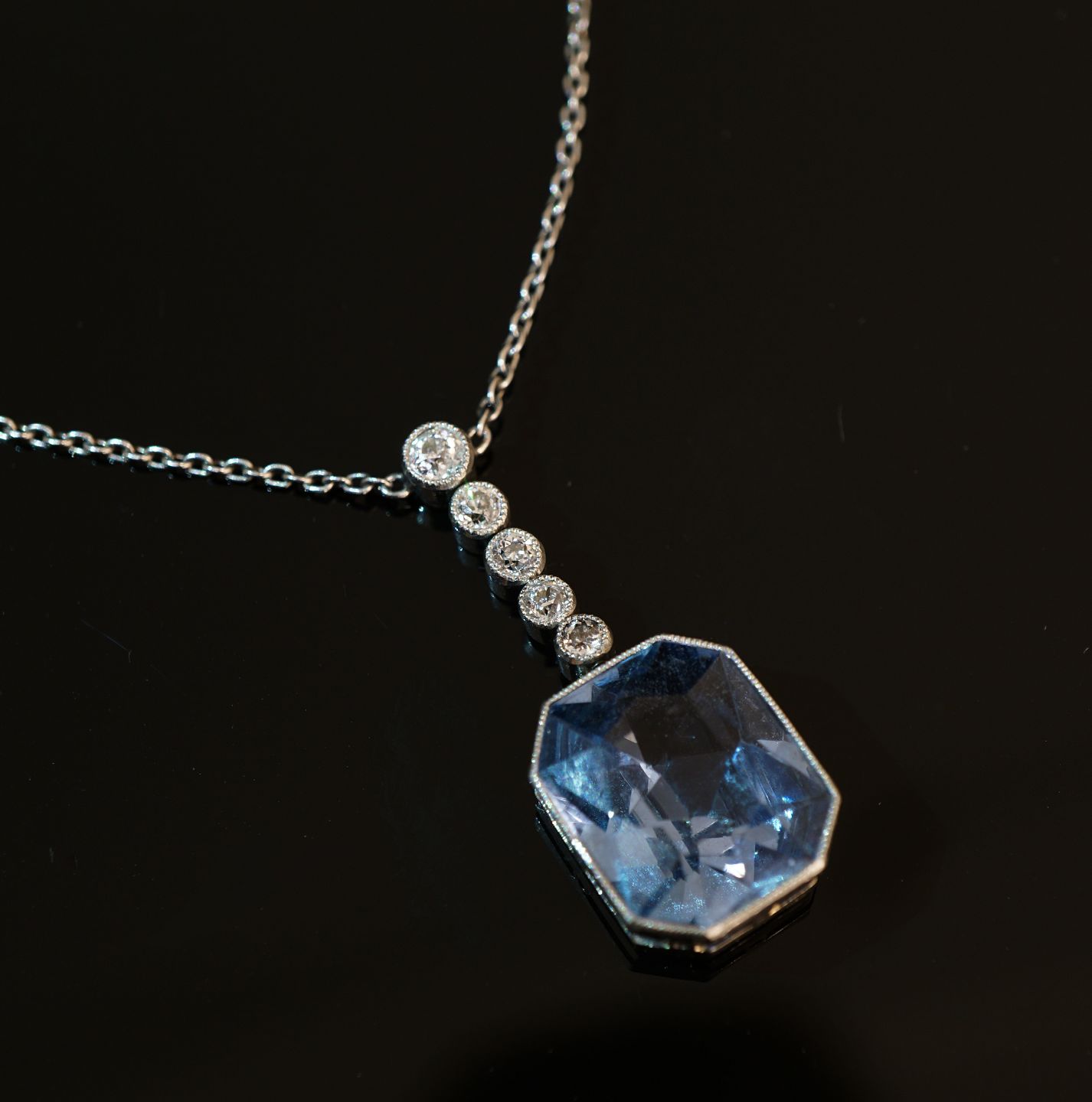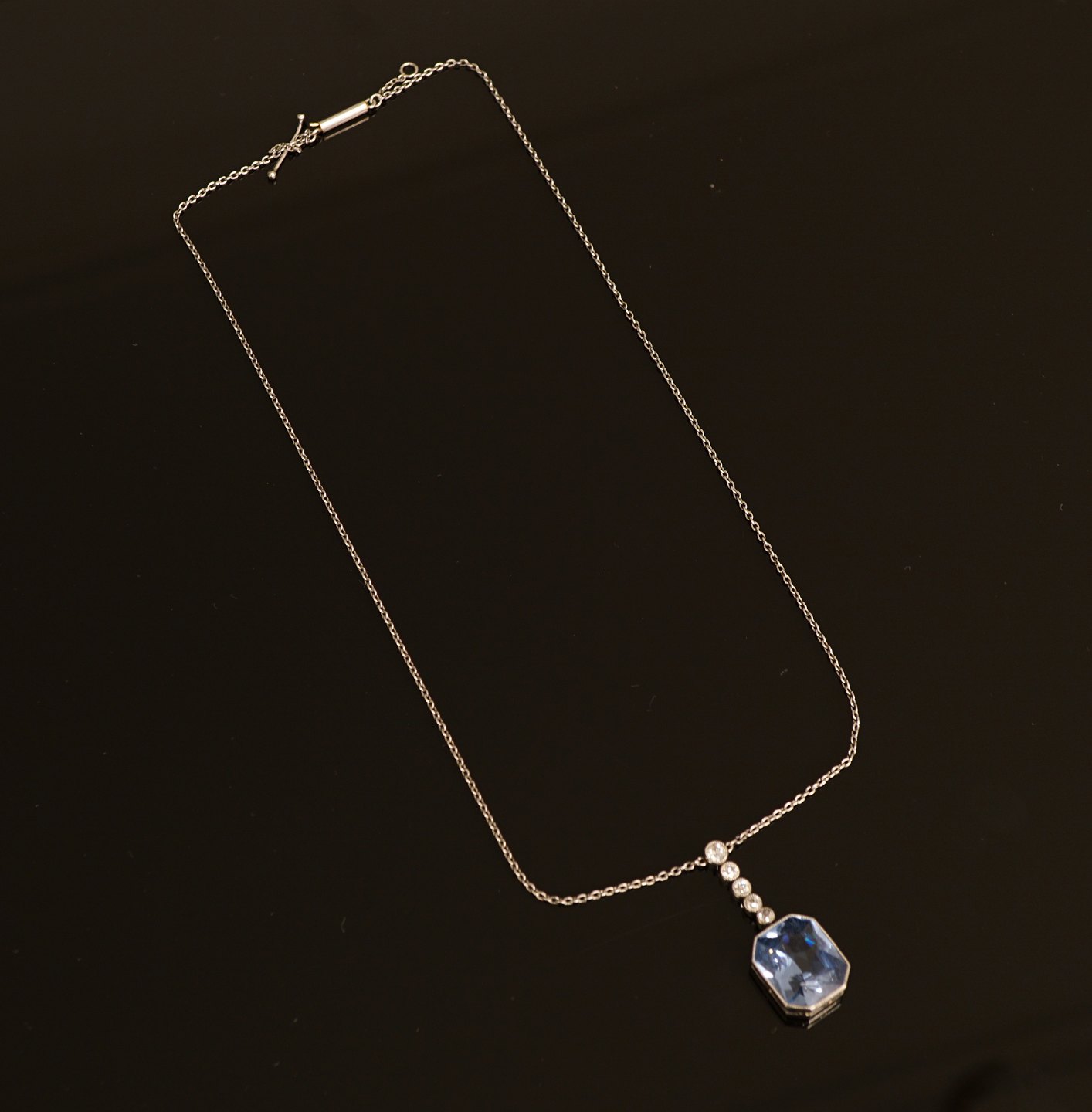 A diamond neckalce set of silver with five diamonds and a aquamarine L: 41cm Item number: 28008