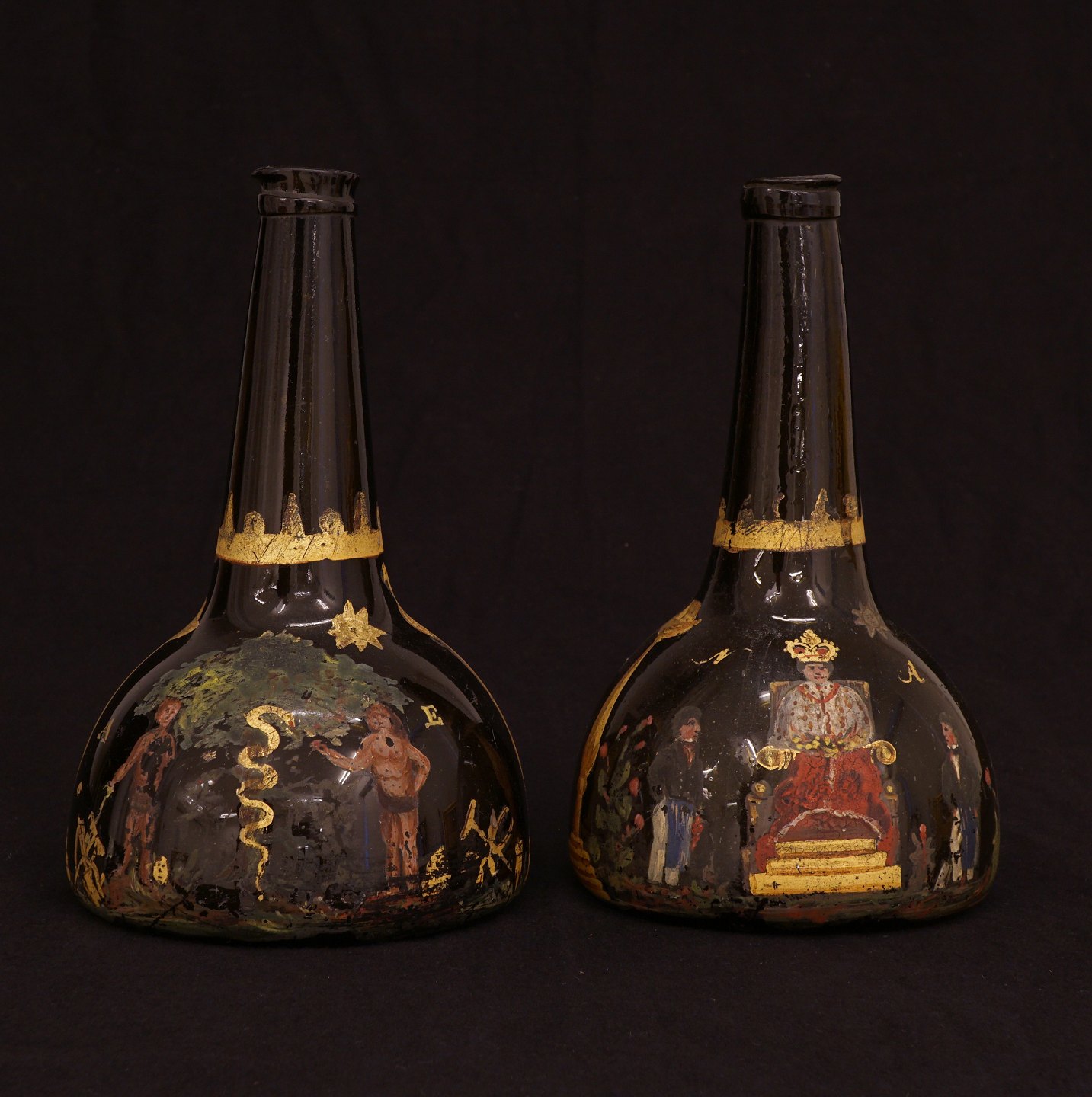 A pair of original decorated bottles. Holland or England circa 1760. H: 22cm