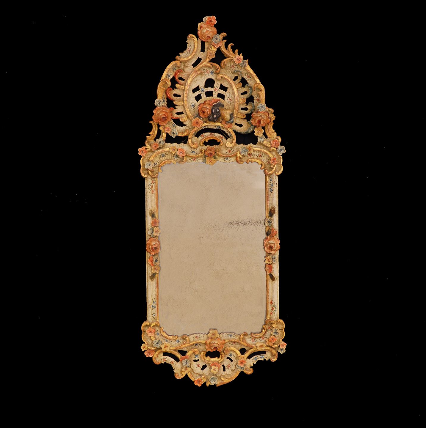 Original decorated Rococo mirror Southgermany circa 1760 H: 91cm. W: 36cm Item number: 16191