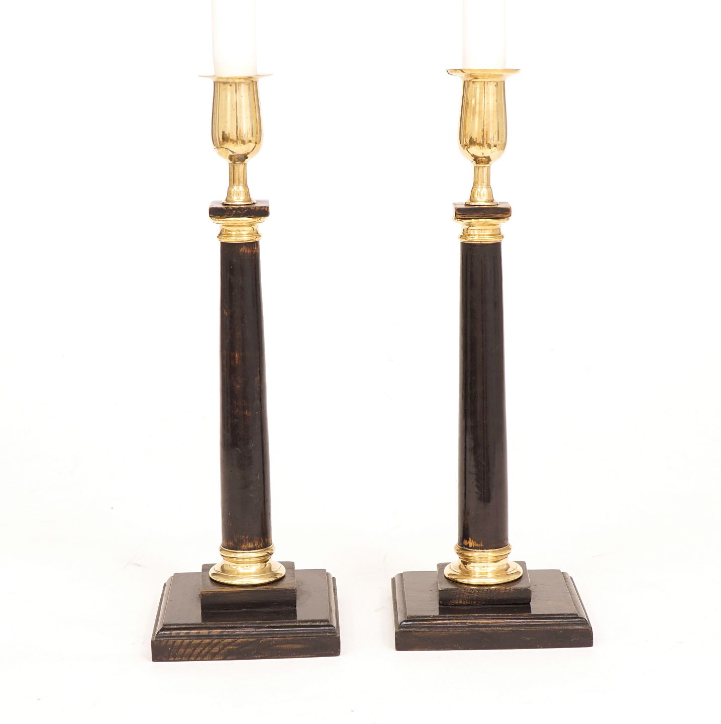 A pair of wood candelsticks with brass mountings