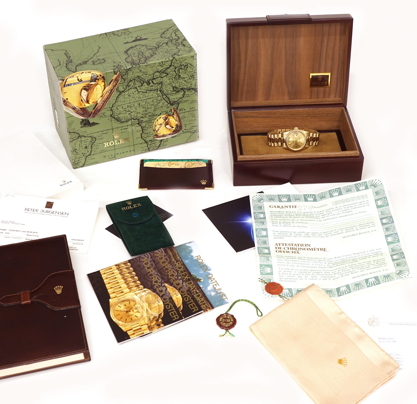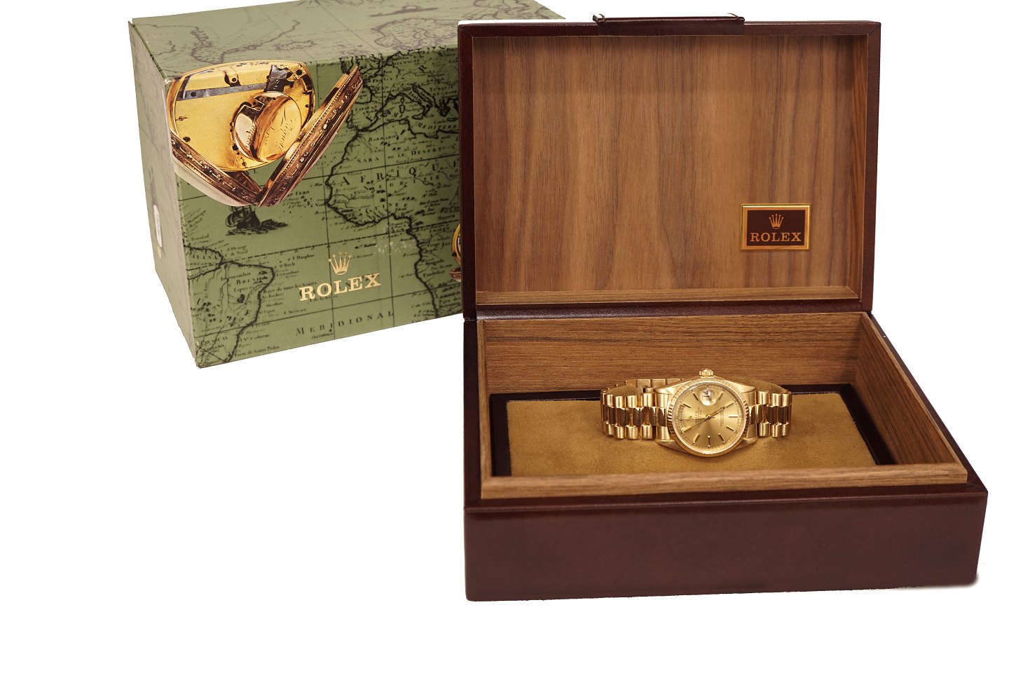 Rolex Day Date i 18kt guld. Solgt 1. gang hos autoriseret Rolexforhandler 23.12.1989. Fuldt sæt med box, certifikat og meget tilbehør. Nyserviceret fra autoriseret Rolex værksted. Ref. 18238. D: 36mm