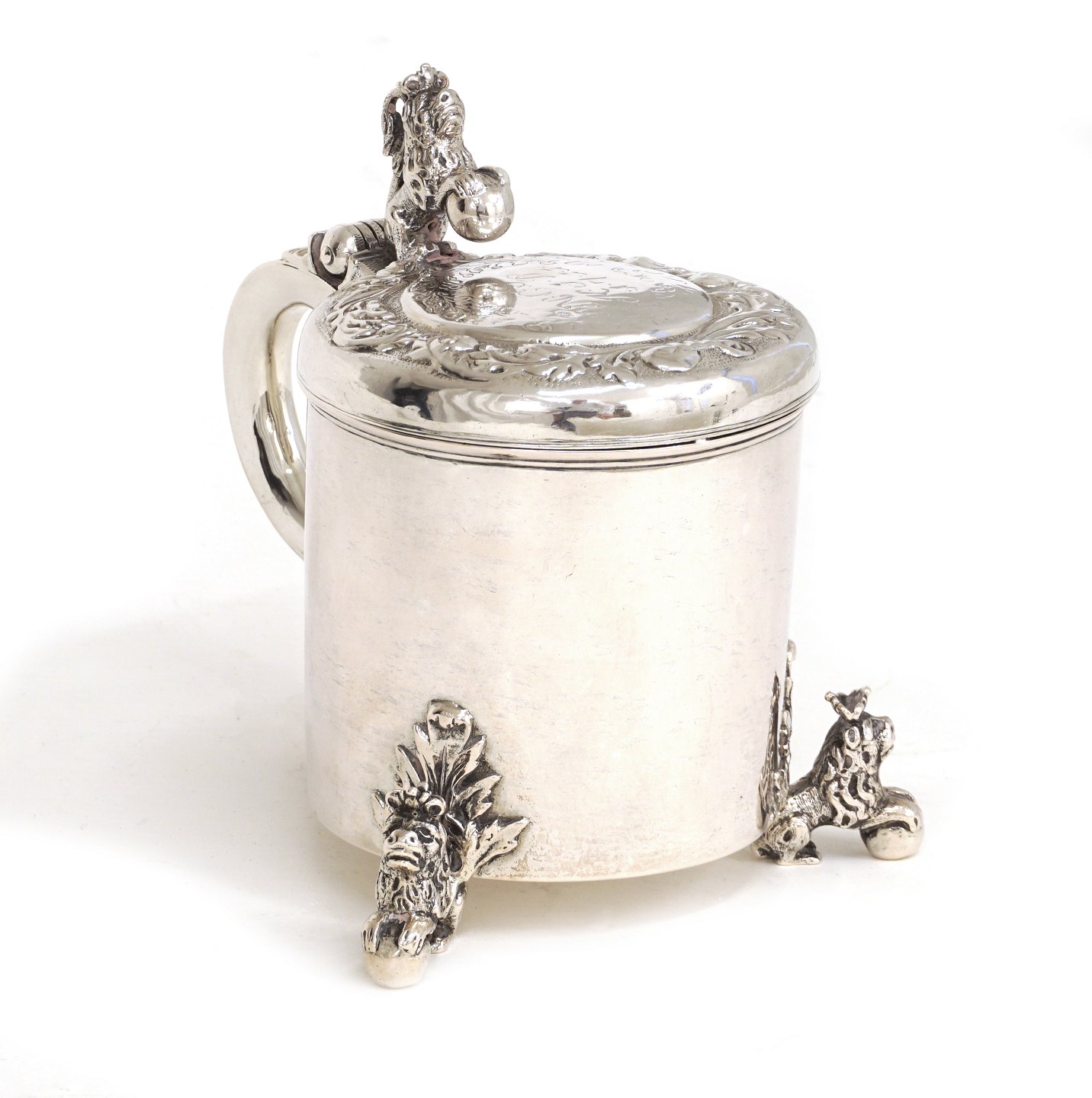 Niels Pedersen, f. Kolding, 1699-1713, Aarhus: Barok lågkrus af sølv med gæk og fødder i form af løver. Låg med ejerinitialer og datering 1711. H: 16,5cm. V: 619gr