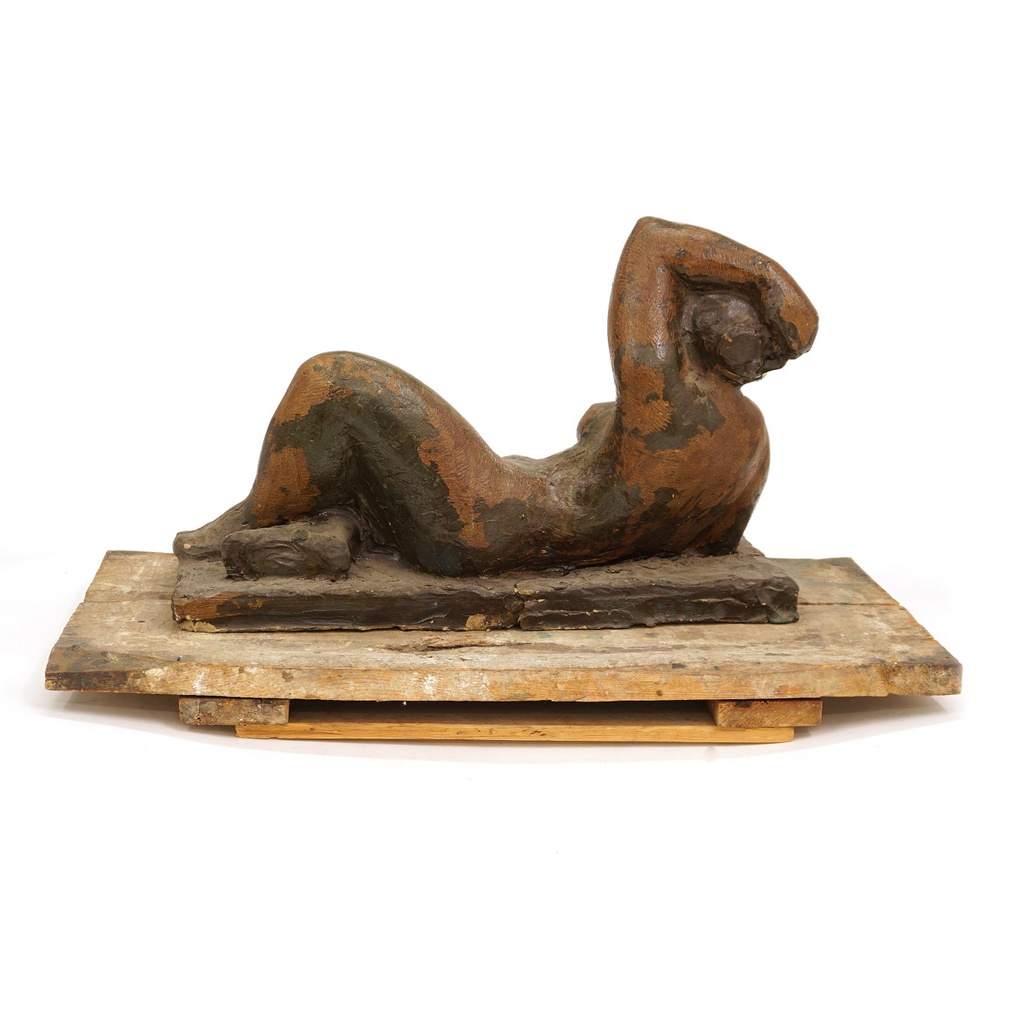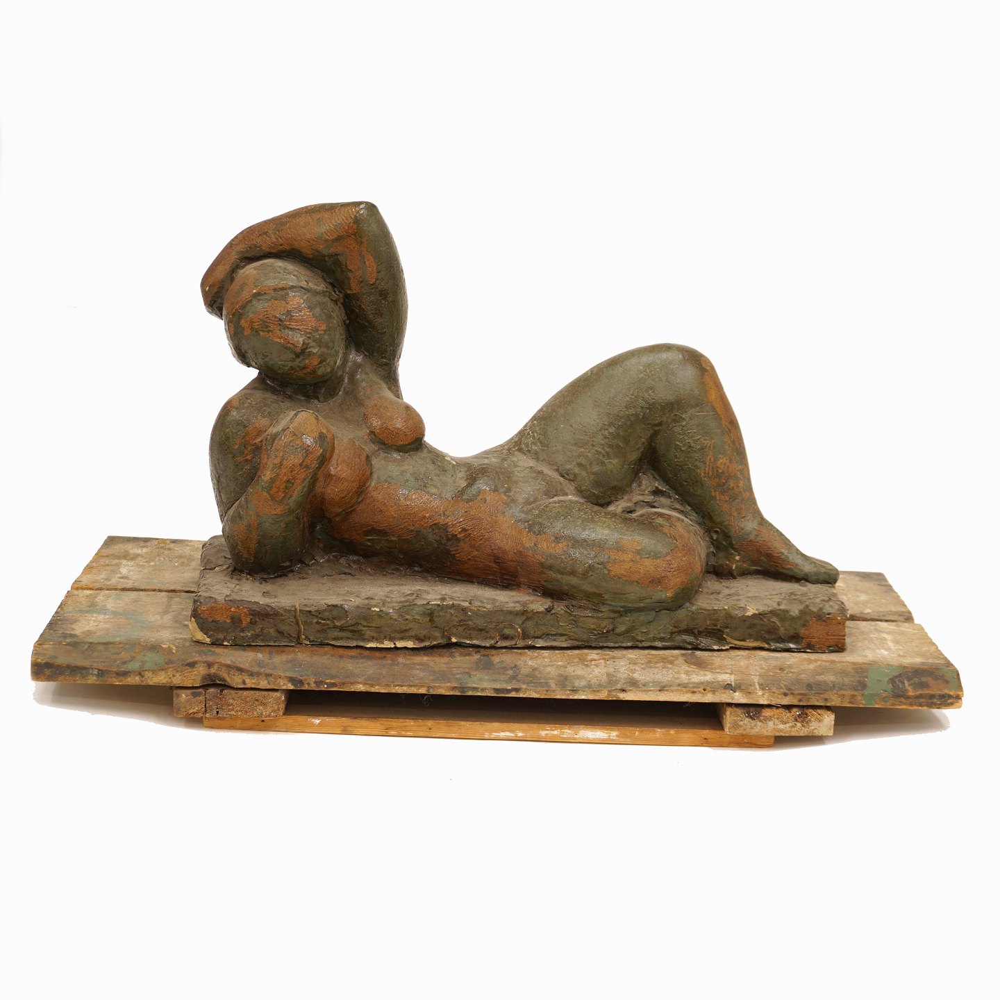 Skulptur in Form von einer ruhenden Frau aus glasiertem Steinzeug