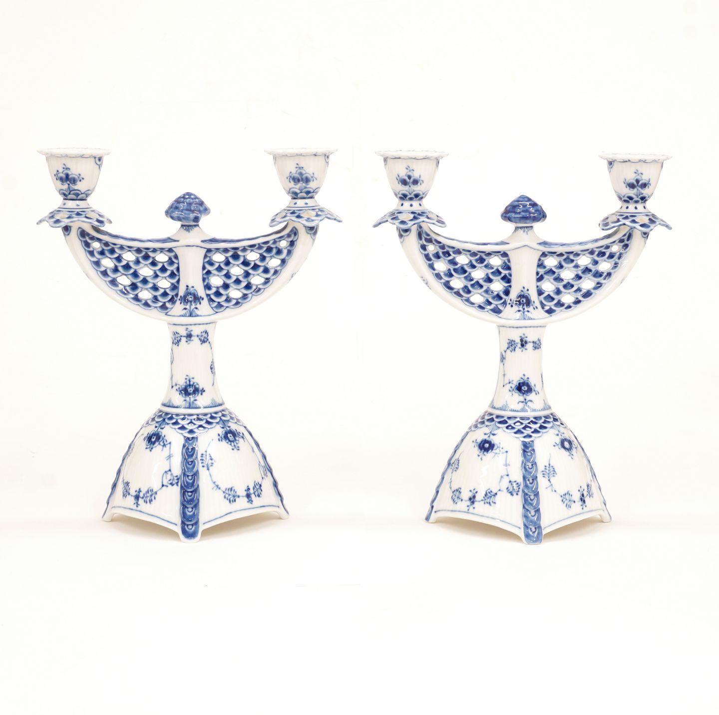 Royal Copenhagen: A pair of blue fluted full lace candelabra 1169