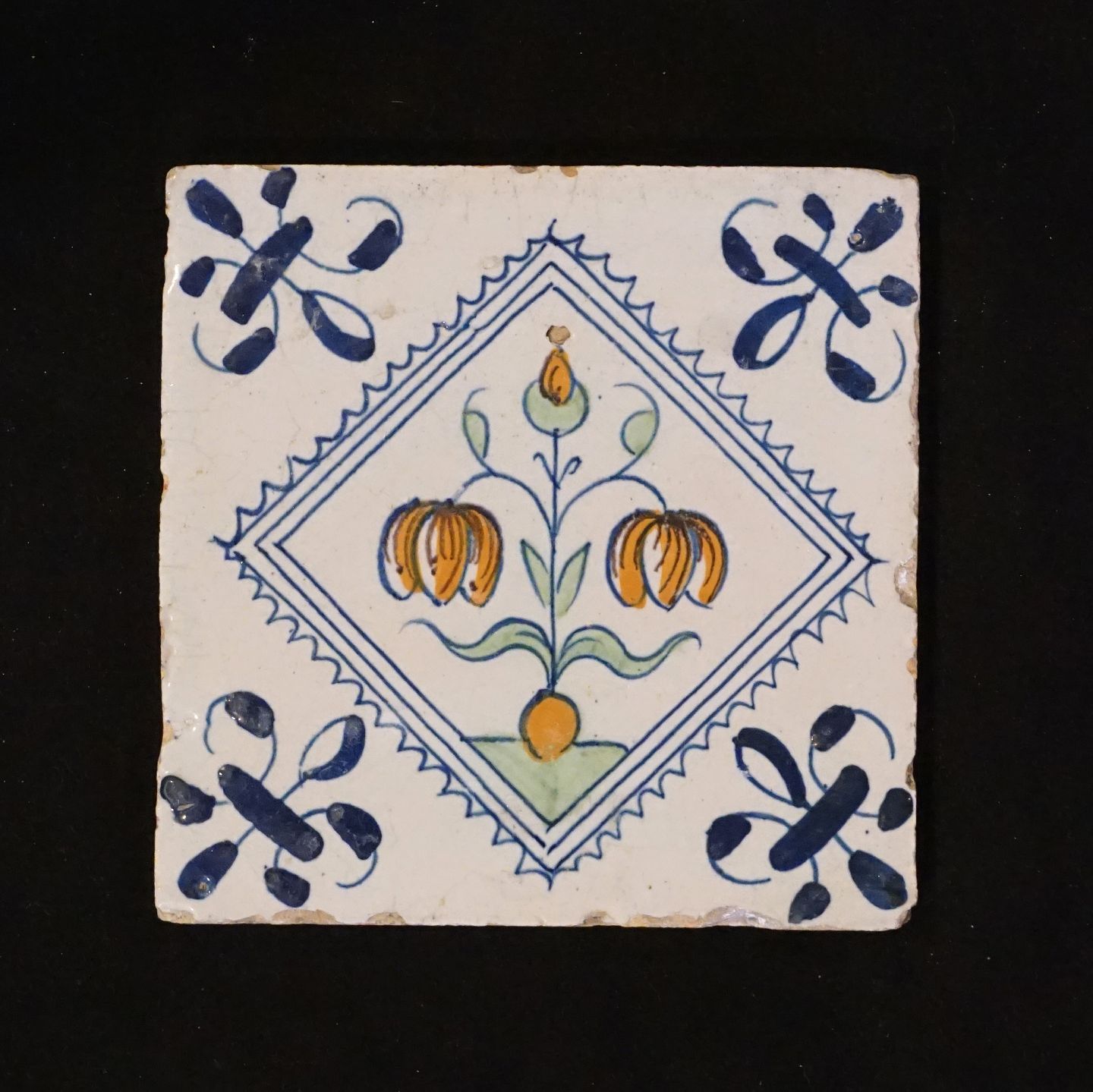 A 17th century polychrome decorated Dutch tile with flowers. Circa 1620-40. Size: 13x13cm