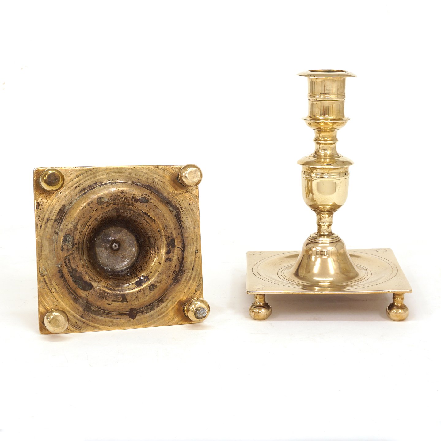 A pair of mid 18th century brass candlesticks. Denmark circa 1740. H: 22cm. Base: 15x15cm
