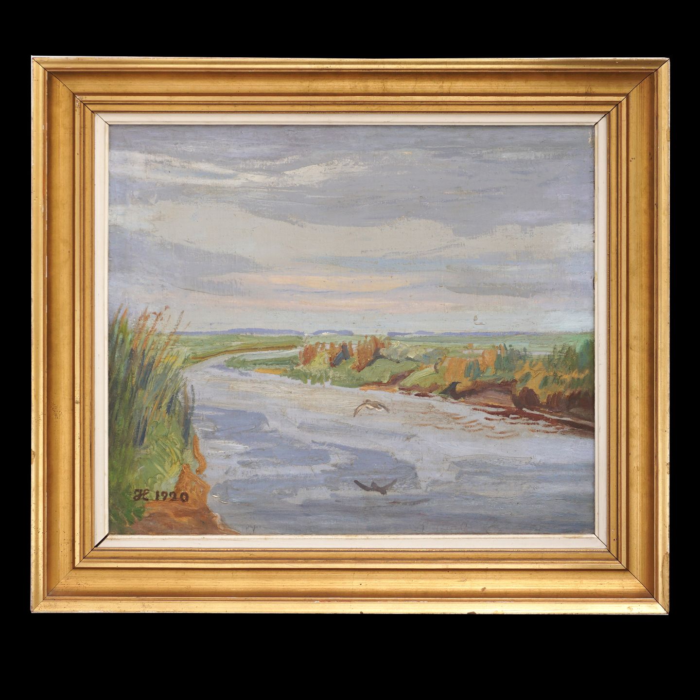 Johannes Larsen maleri. Johannes Larsen, 1867-1961, olie på lærred. Fugl i ålandskab. Signeret og dateret 1920. Lysmål: 43x51cm. Med ramme: 58x66cm