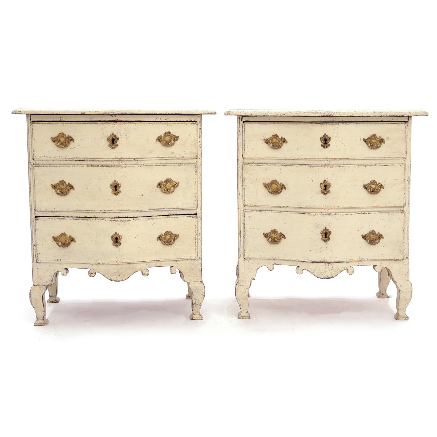 Et par perlemorsfarvede kommoder med tre skuffer. Sverige ca. år 1760. H: 81cm. B: 74cm. D: 42cm