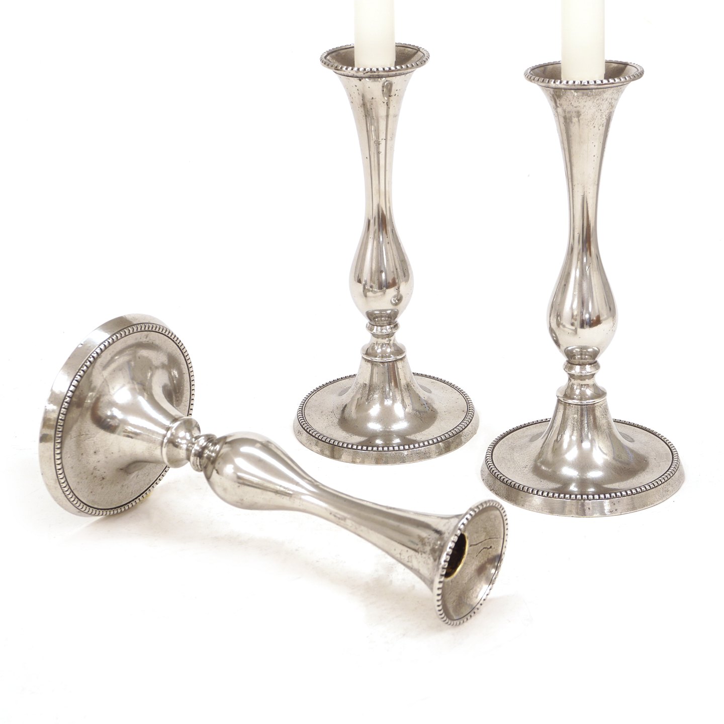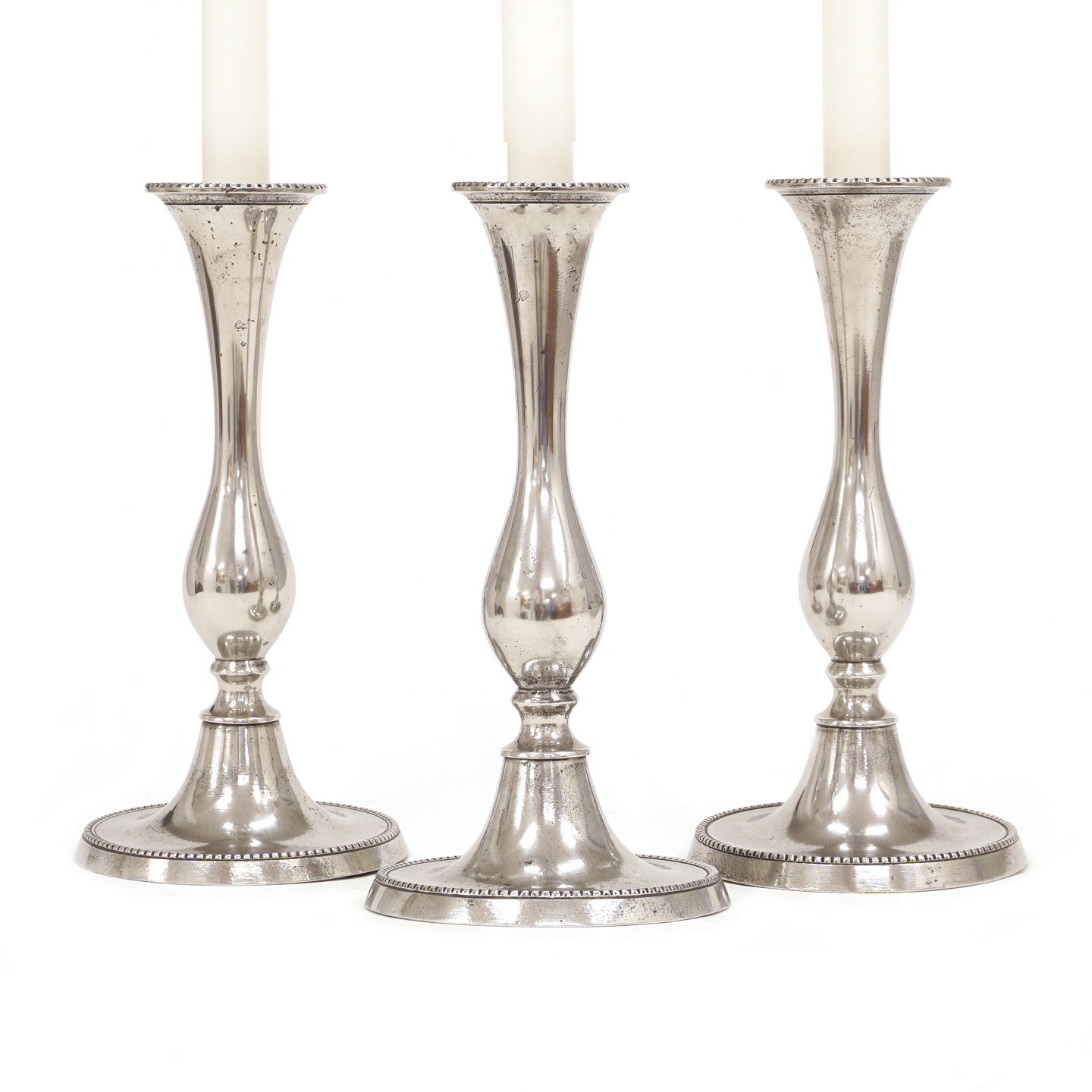 Set of three pewter candlesticks. Circa 1840. H: 24cm