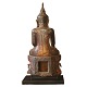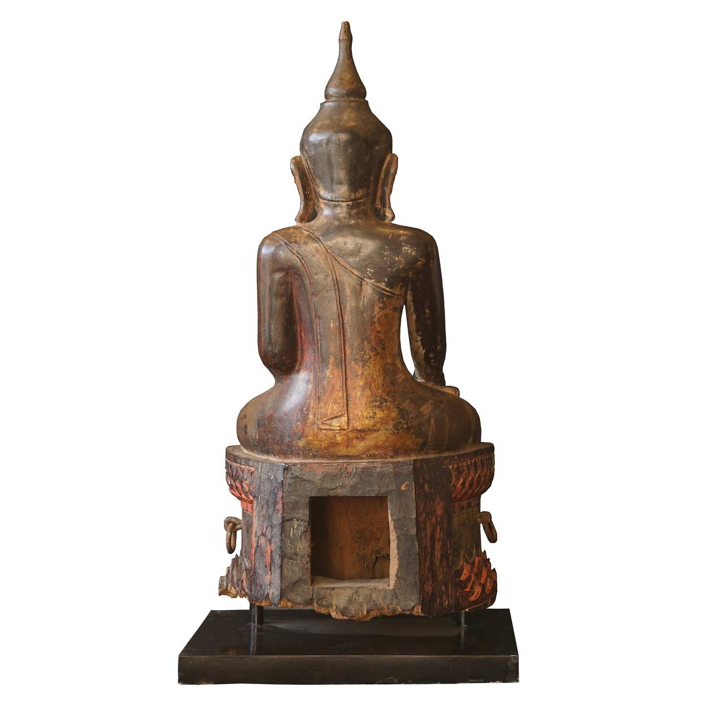 Large sitting Buddha carved in wood with remains of gilt. The Buddha originates from Myanmar in the 18th century. The hole behind the figure was used for offerings and gifts