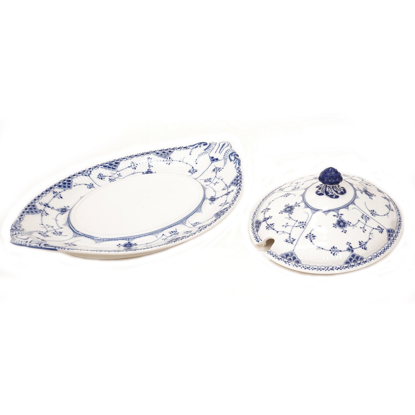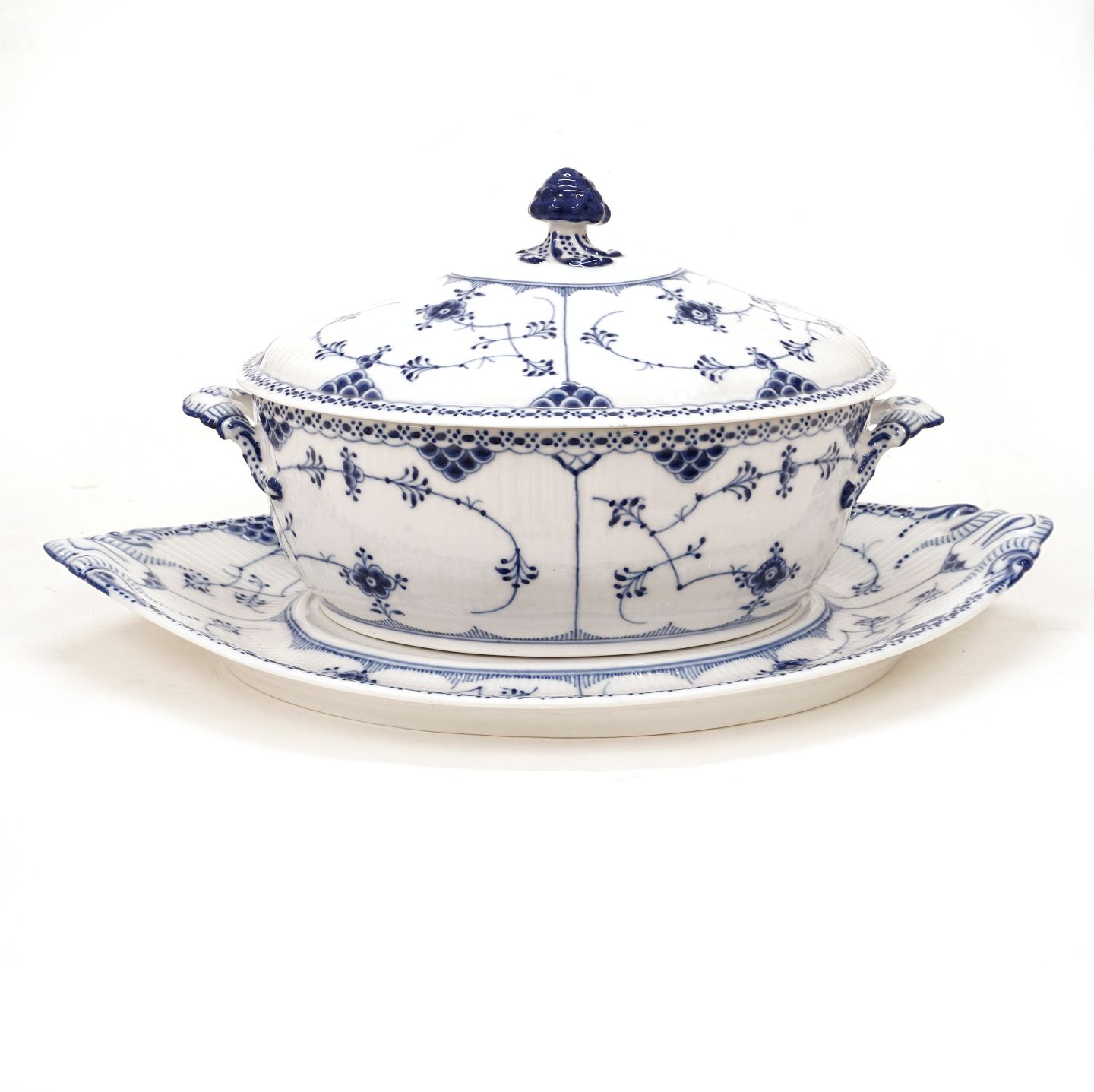 Royal Copenhagen blue fluted half lace tureen. 1. quality. #600 & #702. Nice condition. H: 25cm. L: 50cm