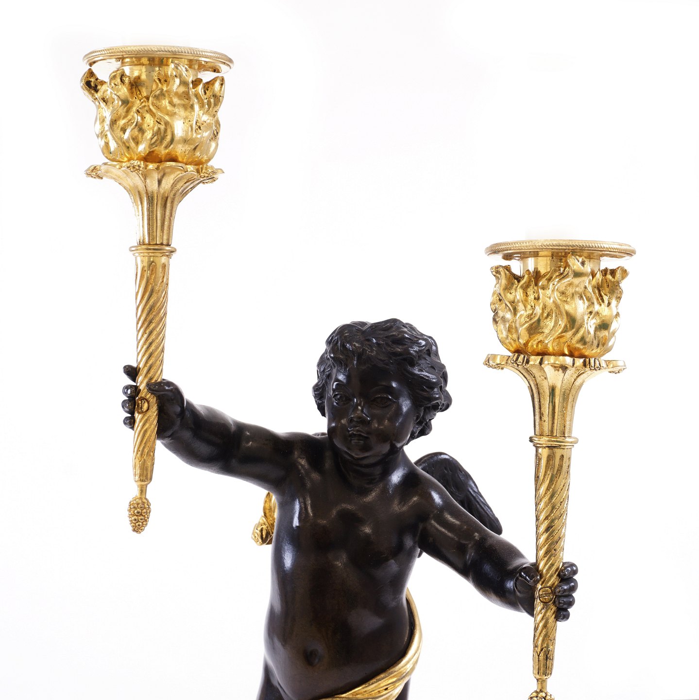 A Pair of early Empire fire gilt bronze candelabra with two putti each carrying two candlesticks