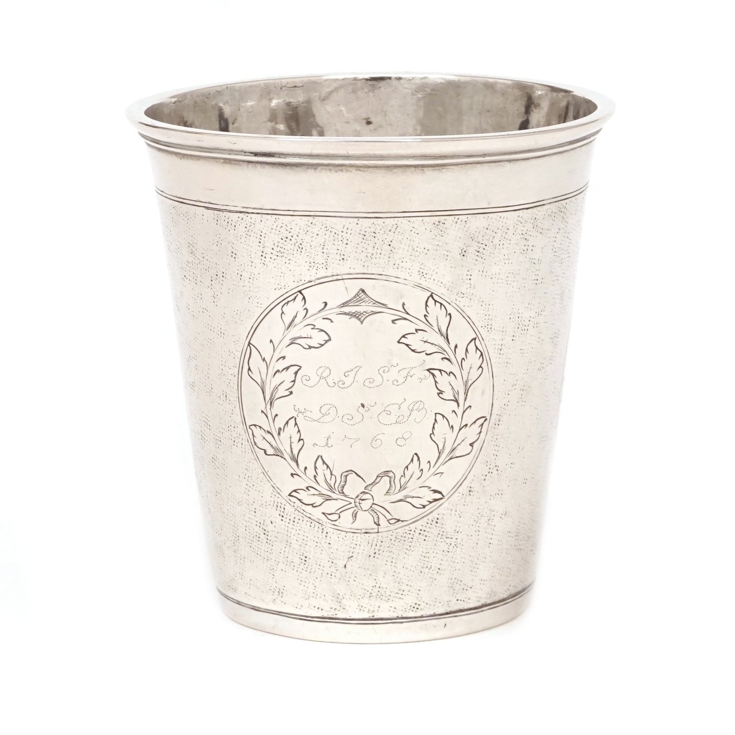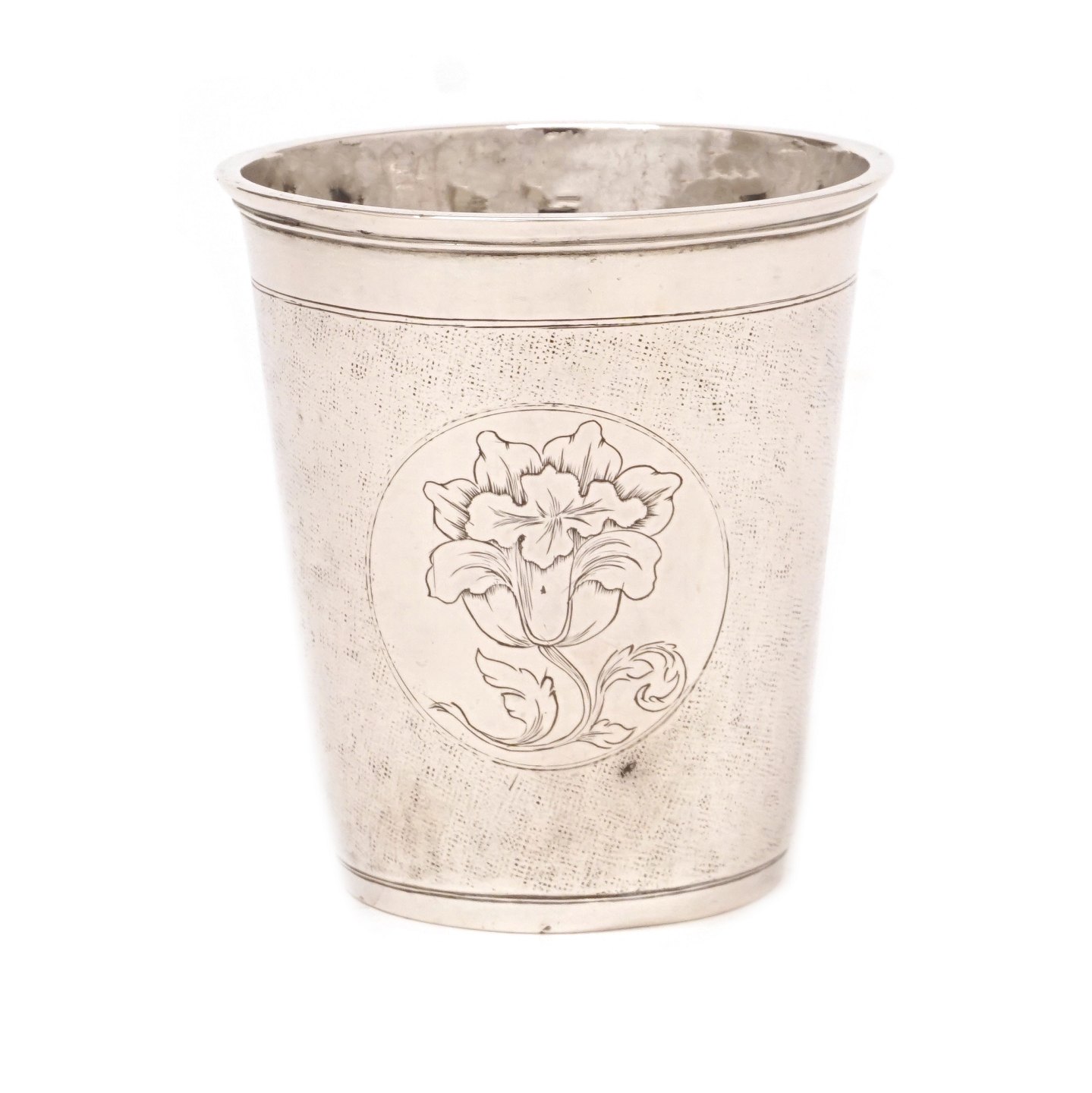 Nålepunlset sølvbæger med tre kartoucher, hvoraf to med stiliserede blomster og en med navnetræk og datering 1768. Mester Knud Rasmussen Brandt, Horsens, 1737-85. H: 9,7cm. V: 170gr