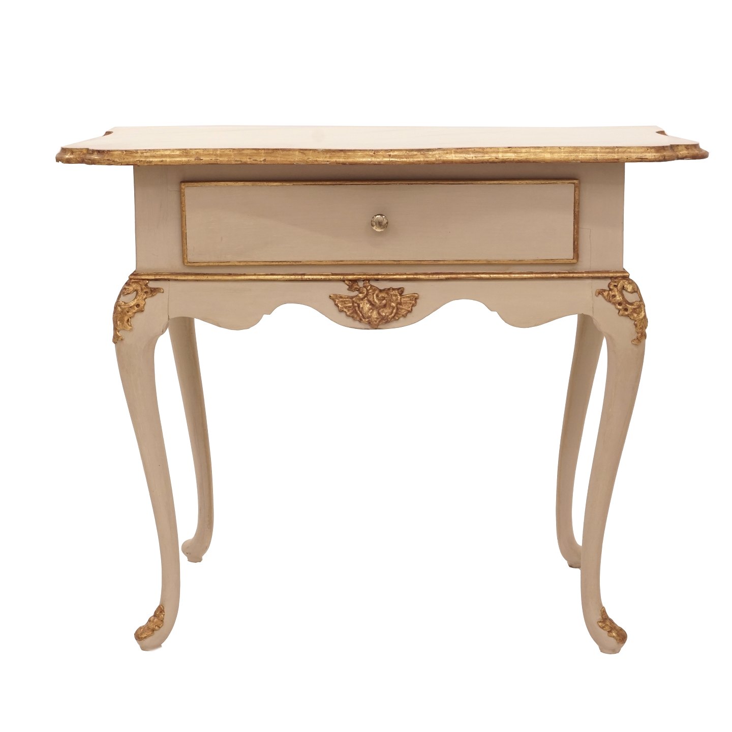 Pair of ivory white Rococo console tables with drawers and gilt carvings. Can be used freestanding. Denmark circa 1760. H: 77cm. Top: 61x94cm
