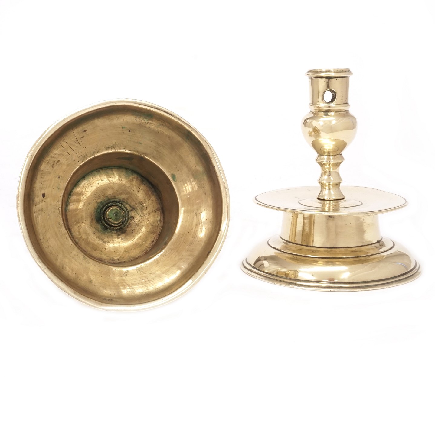 Pair of early 17th century bell shaped brass candlesticks. H: 13,5cm