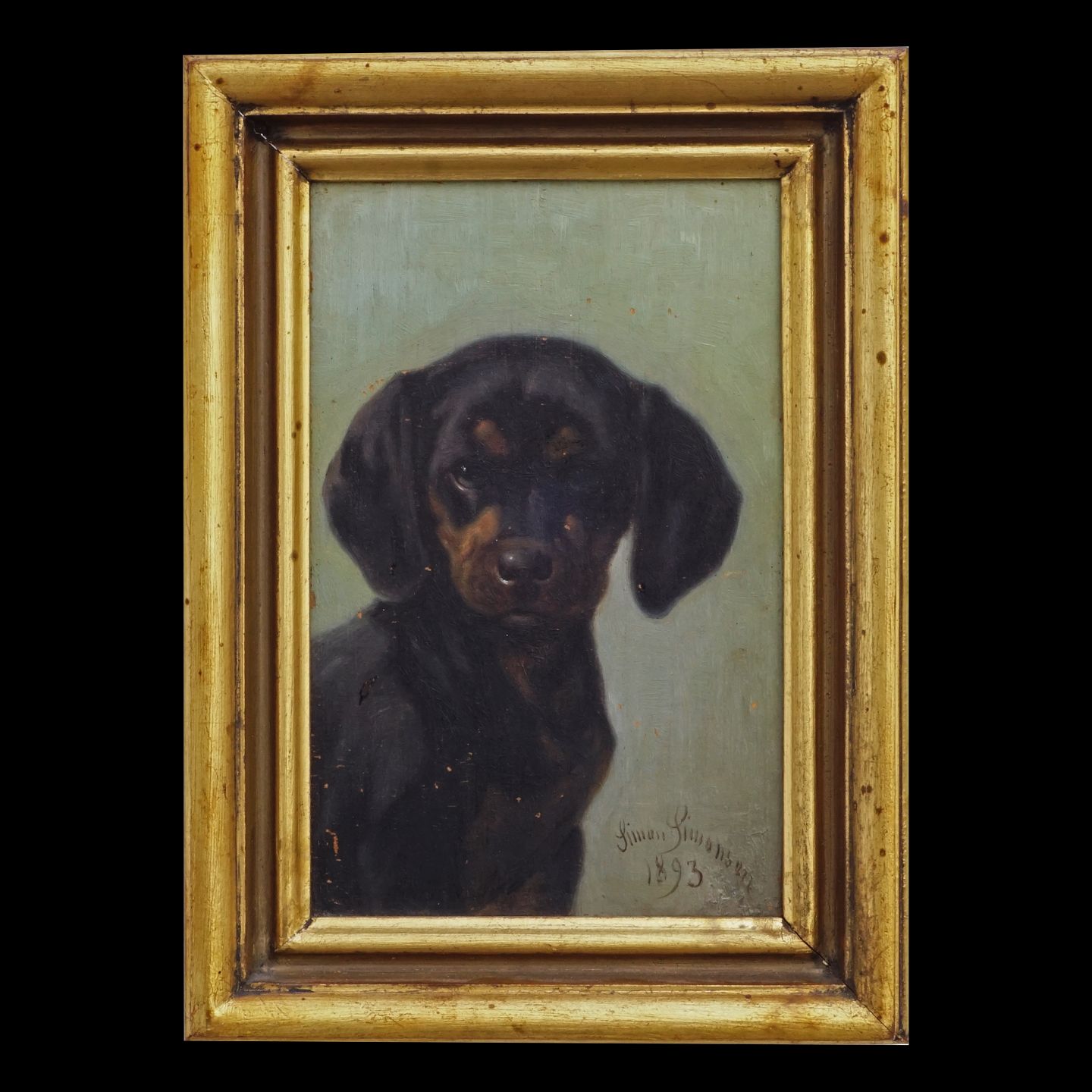 Simon Simonsen, 1841-1928, oil on plate. Dachshund. Signed and dated 1893. Visible size: 17,5x11cm. With frame: 23,5x17cm