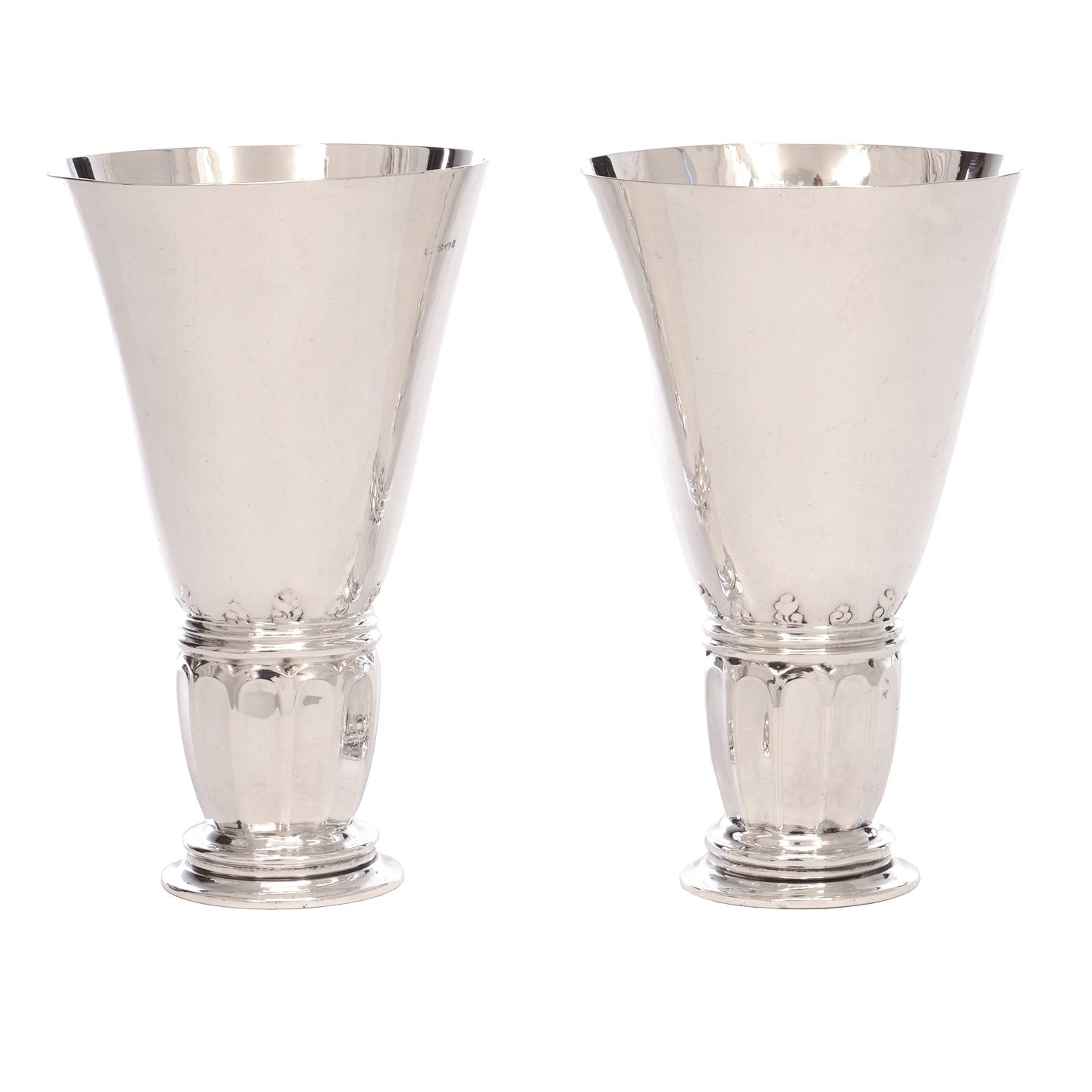 Et par let hammerslåede trompetformede sølvvaser med kanelleret stamme på rund fod