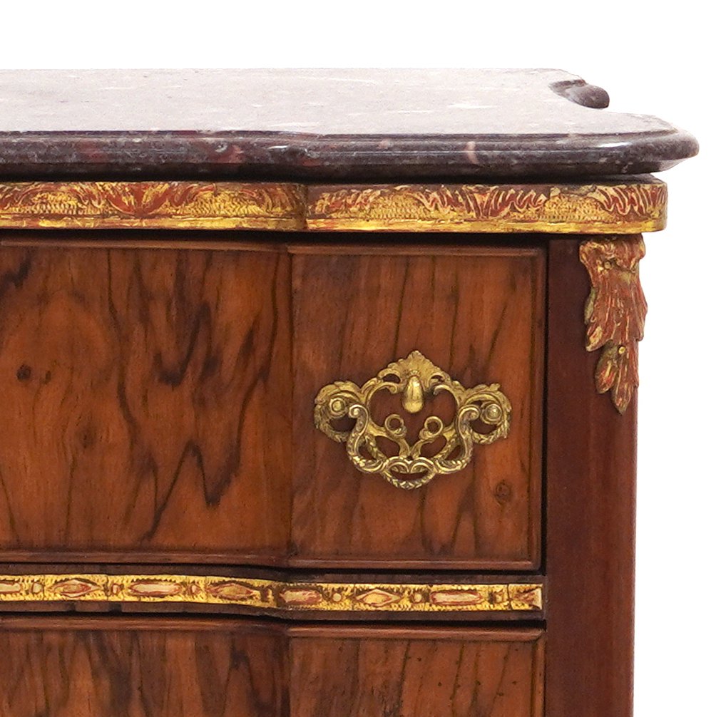 Padouk veneered and partly gilt marble top commode made by the manufacture Köster, Altona, Northgermany, circa 1770. Signed