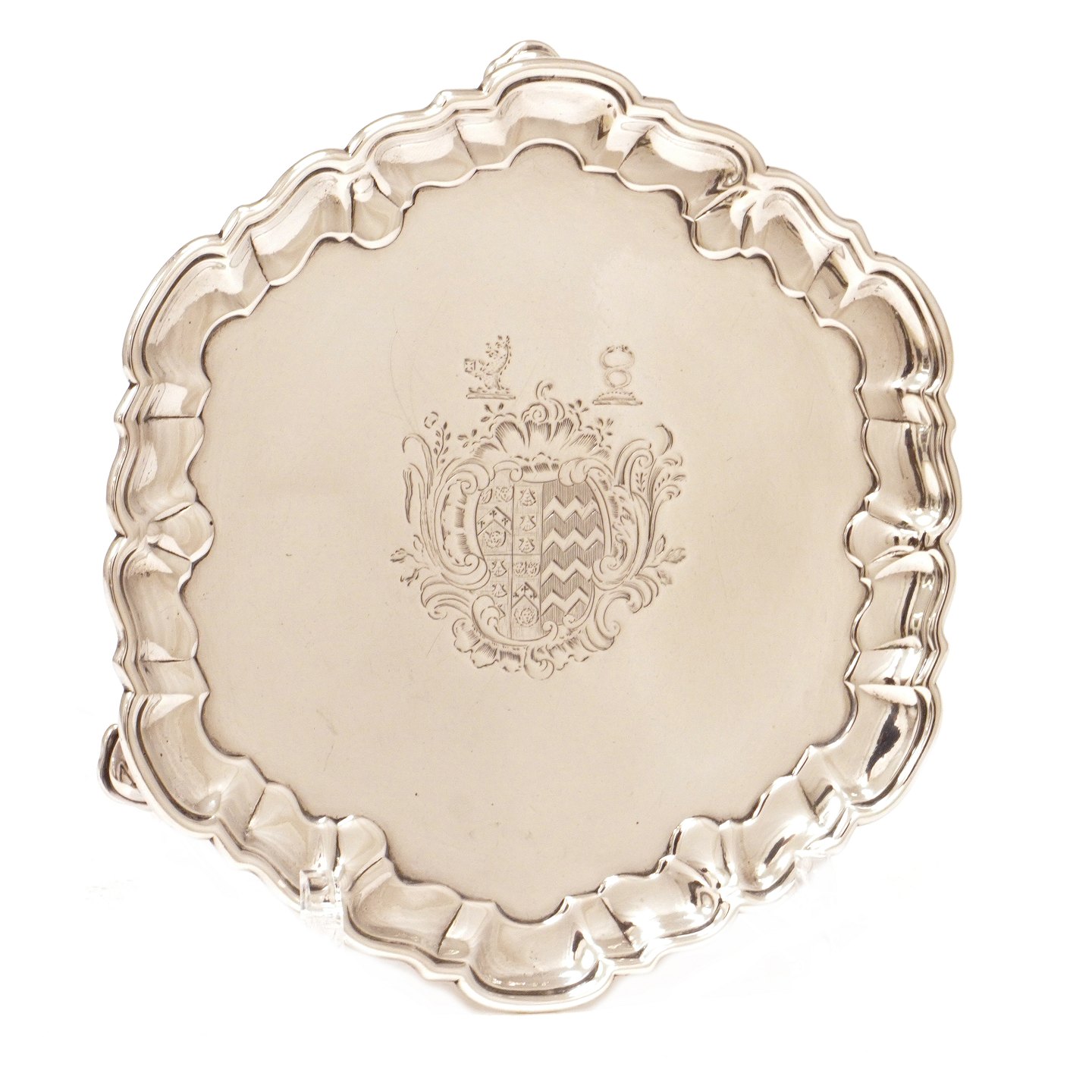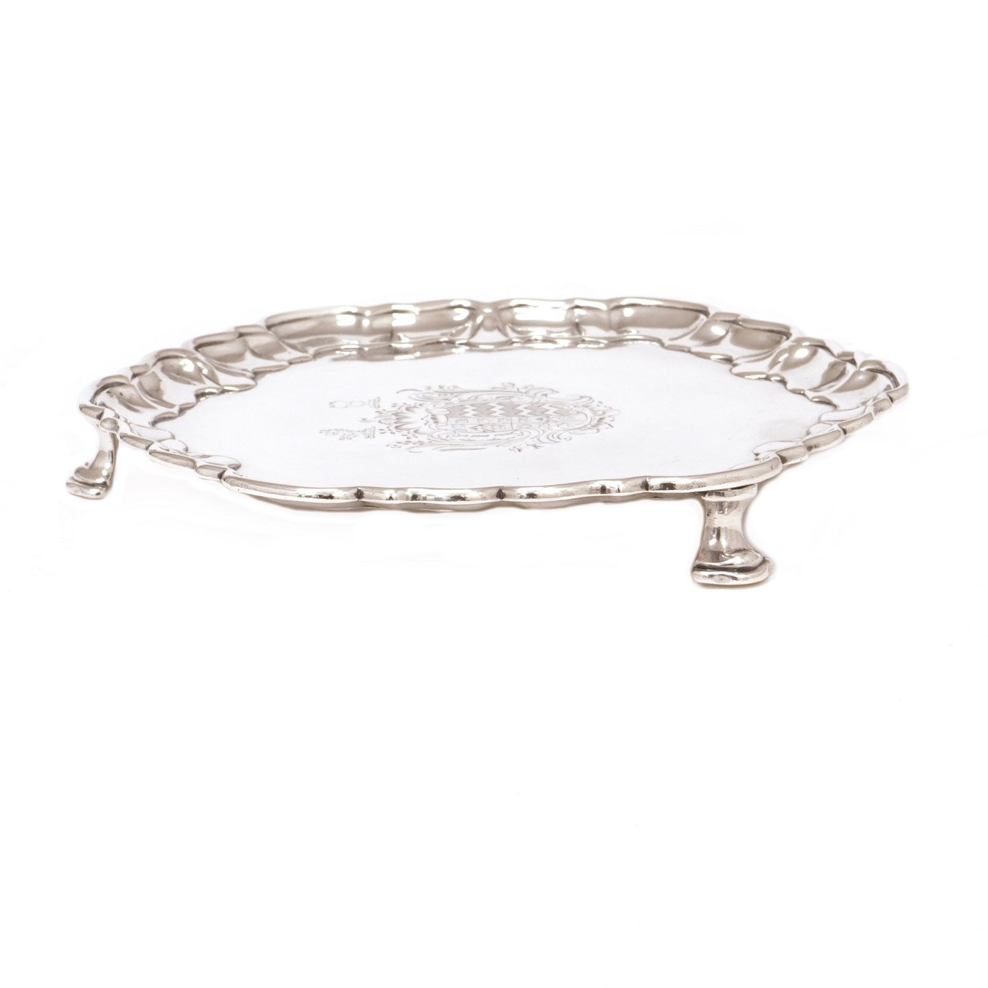 George II silver salver with coat of arms. London 1736-37. H: 2cm. D: 18cm. W: 372gr