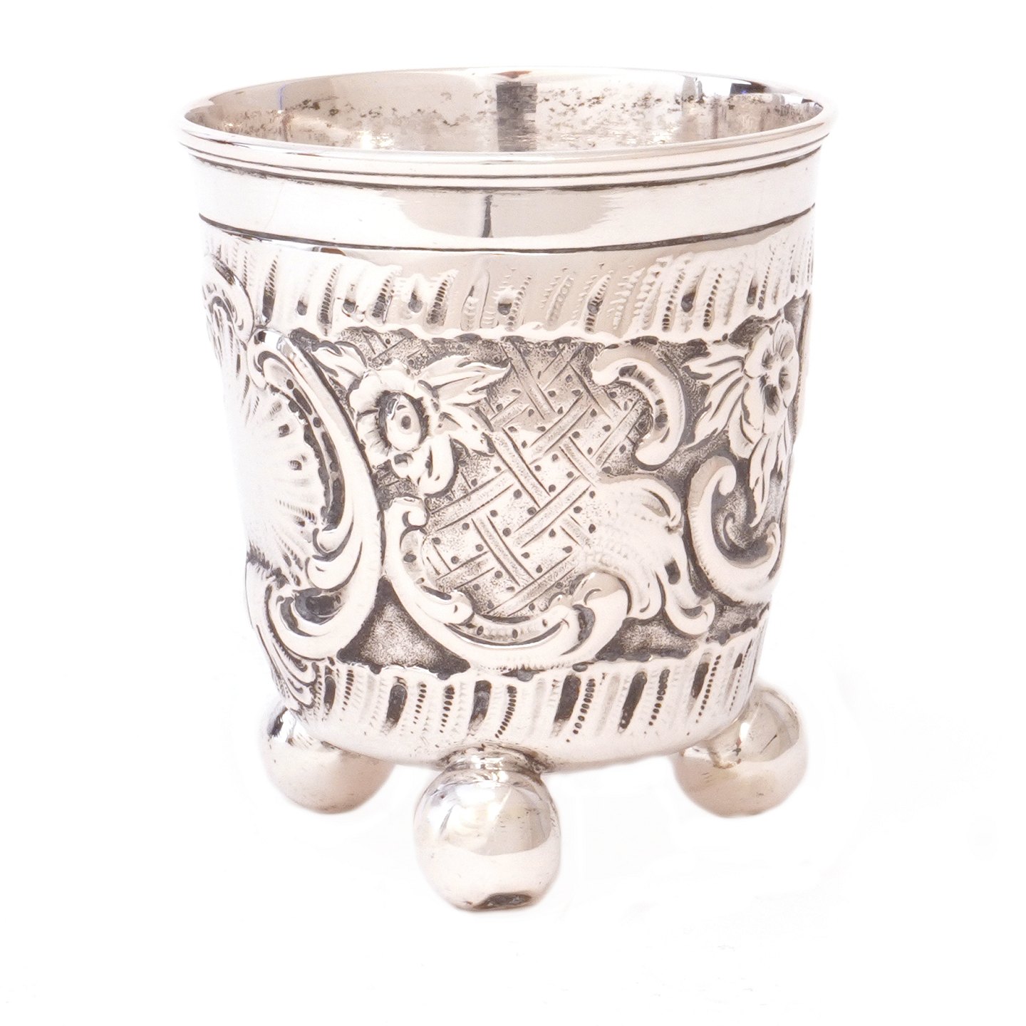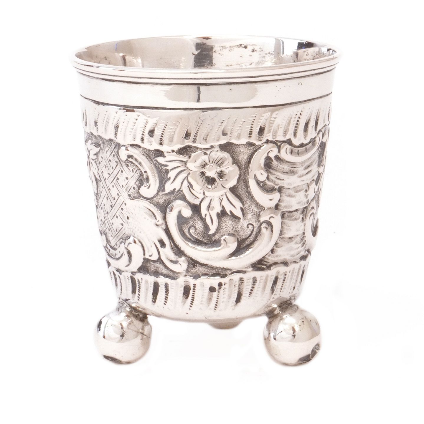 Barokt sølvbæger med drevne dekorationer i form af stiliseret bladværk og rocailler