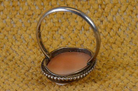 Camé ring af sølv med damehoved skåret af konkylie, monteret i sølvramme omkranset af perlekant. Str.: lille Art No. 52