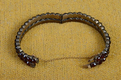 tilbyder i kategorien: Antikt bøhmisk granat armring bestående af to række rosen facetslebne granater. Armbåndet er hængslet på den ene side og har et spænde på den anden med den oprindelige sikkerhedskæde. Forgyldt sølv. Størrelse: oval 5 * 6 cm. Art nr 106 ![]() In English please