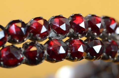 tilbyder i kategorien: Antikt bøhmisk granat armring bestående af to række rosen facetslebne granater. Armbåndet er hængslet på den ene side og har et spænde på den anden med den oprindelige sikkerhedskæde. Forgyldt sølv. Størrelse: oval 5 * 6 cm. Art nr 106 ![]() In English please