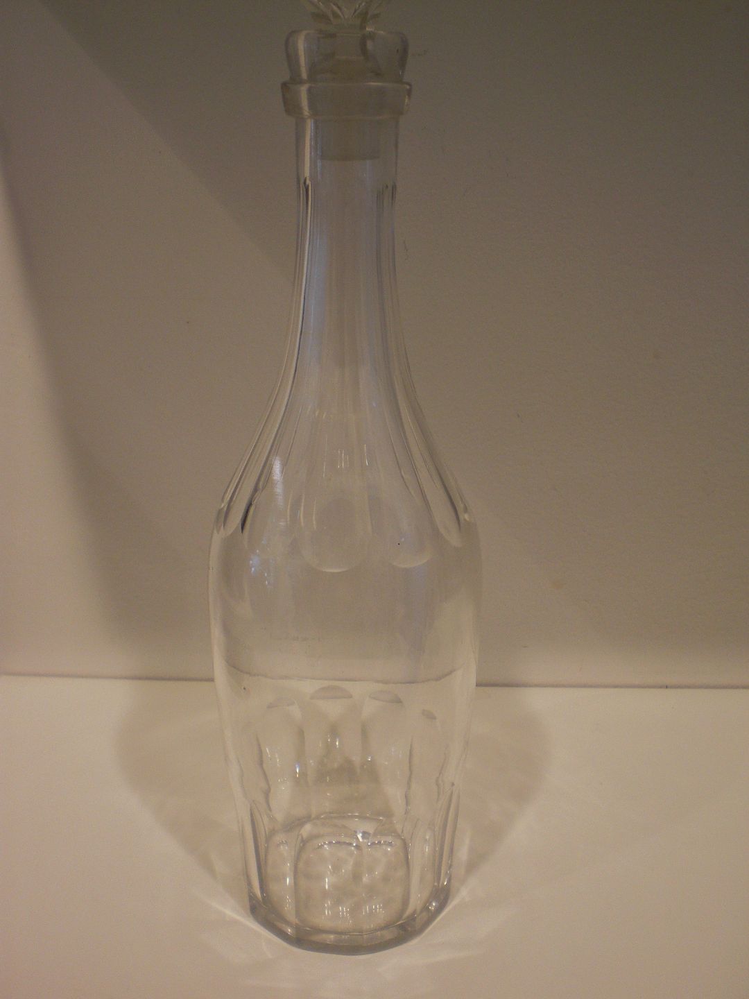 Høj facetsleben karaffel uden iboret prop. Flaskeformet med facetter nær bunden og på den høje hals. Ca. 1910 - formentlig Holmegaard. Uoriginal prop kan medfølge. Højde uden prop: 29,4 cm.