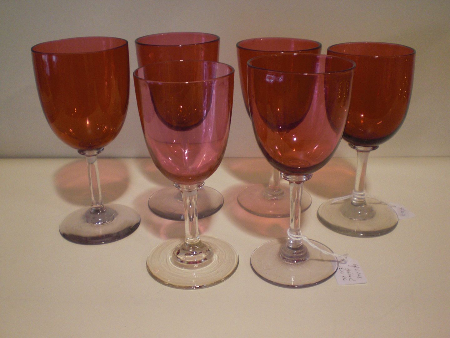 6 engelske rubinrøde (farve er lavet med guldklorid) Bristol hvidvinsglas 1830-1840. Bristol husede et stor antal glaspusterier helt tilbage fra 1740. Det mest kendte er Bristol Blue som stadig eksisterer i dag. Denne glastype blev fremstillet på flere værksteder og bredte sig også til Frankrig. Højde: 12,5 - 13 cm. Priser fra 300 - 400 kr.