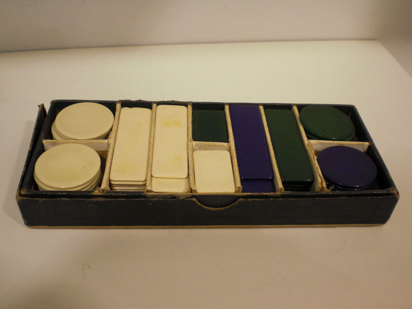 Sæt af jetoner i tidlig plastmateriale. Ca. 1930. Jetoner i hvid, rød, grøn og lilla. Æskens mål: 17 x 7 2,3 cm.
