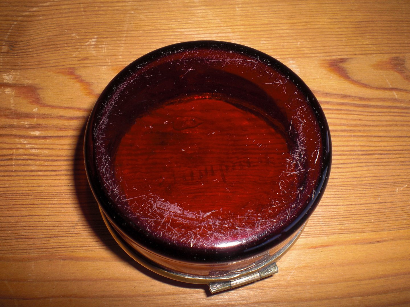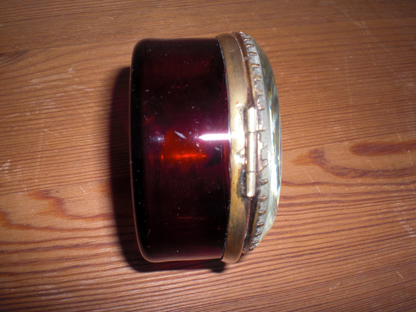 Tysk glasæske i rødt og hvidt glas med messingmontering. 1880er turistting fra Hamburg med bynavnet slebent ind i låget med blomsterdekoration. Diameter: 6 cm. Højde: 3,2 cm. I fin stand