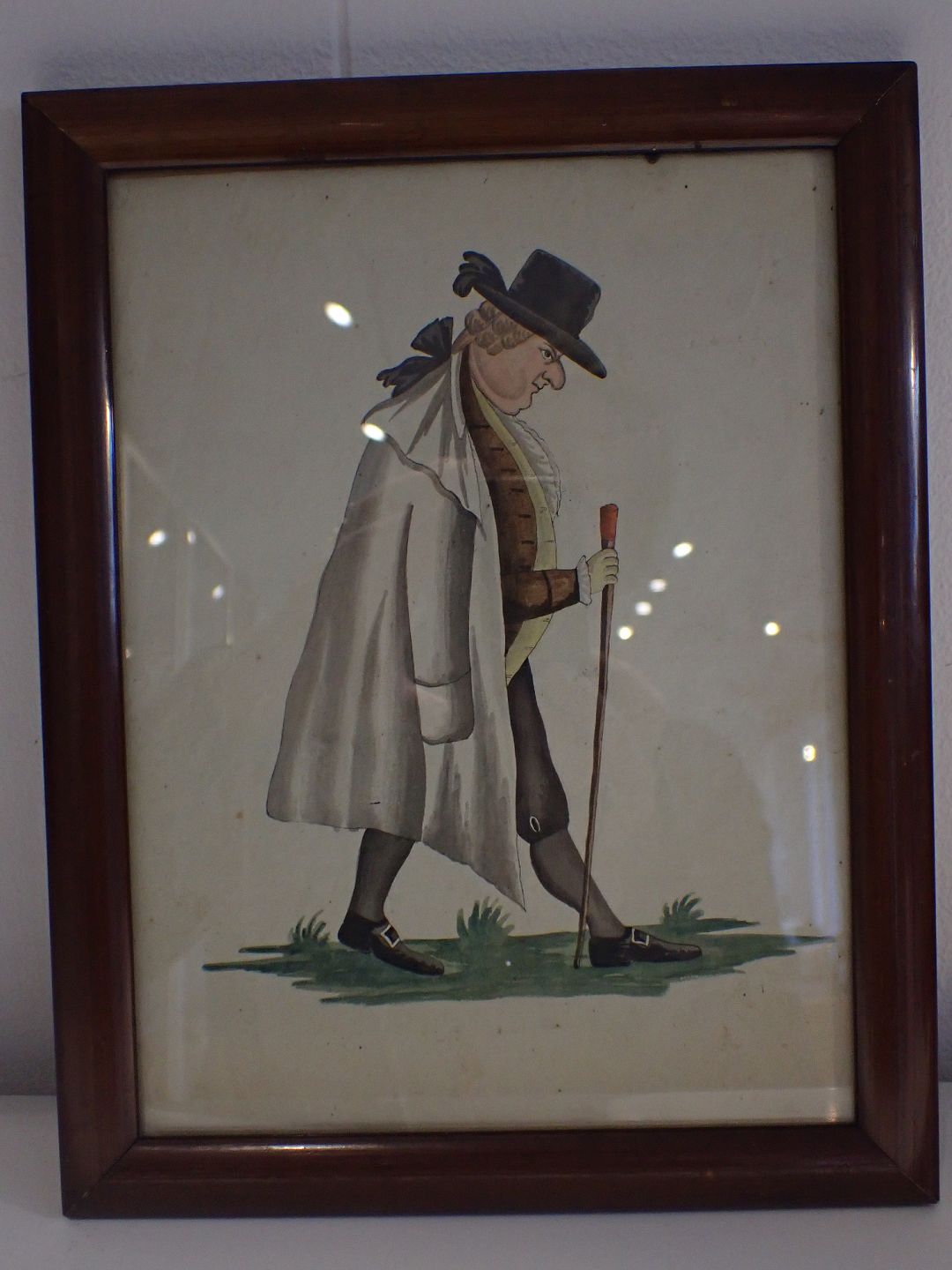Indrammet akvarel fra sent 1700-tal/ tidlig 1800-tal. Karikatur af kraftig, spadserende herre med stok. Usigneret. Ydre mål: 27 x 21 cm. I pøn stand i forhold til alder. Ramme med egetræ på bagside.