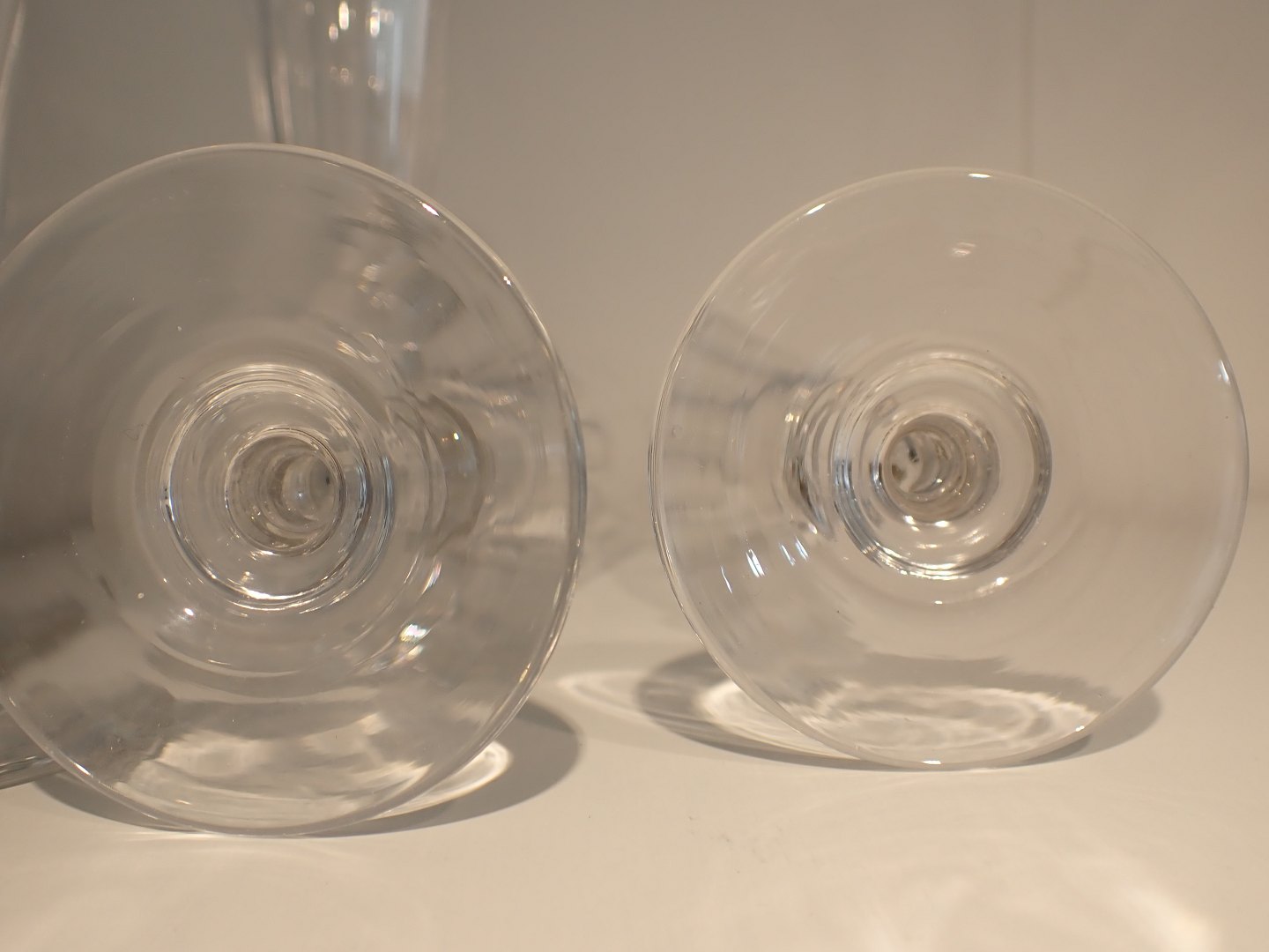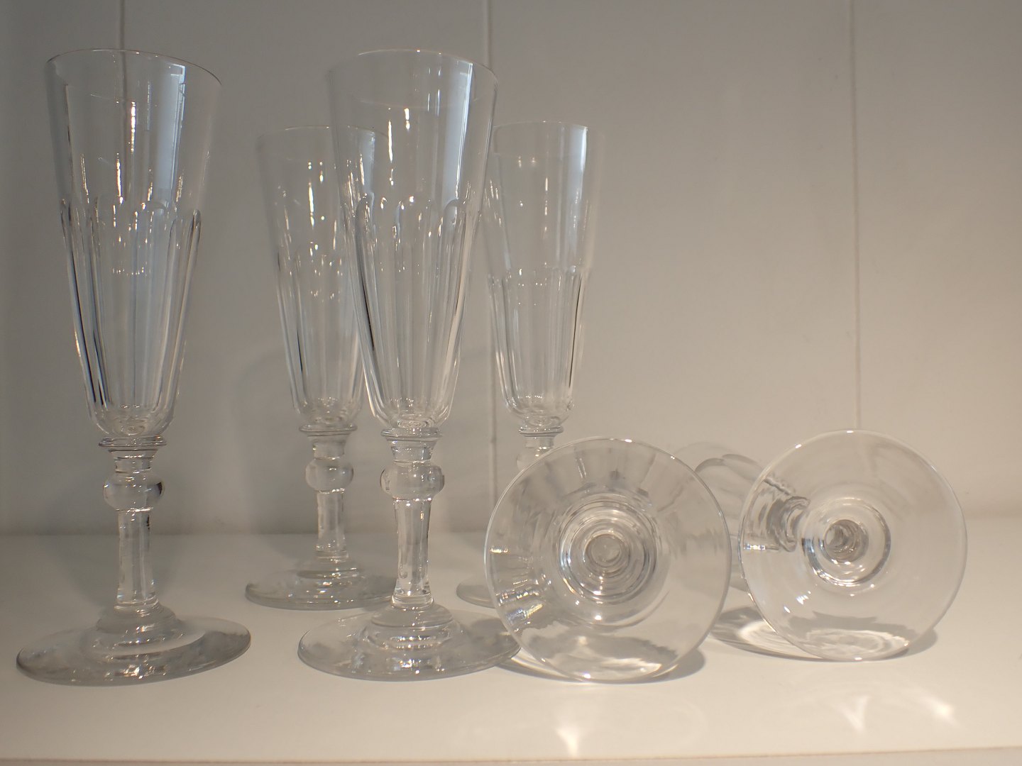 6 champagnefløjter berlinois med facetslebet kumme og med rund kugle på stilk. Kuglet fod. Danske Ca. 1900. Højde: 18,0 - 18,4 cm.. I fin stand. Sælges kun samlet.