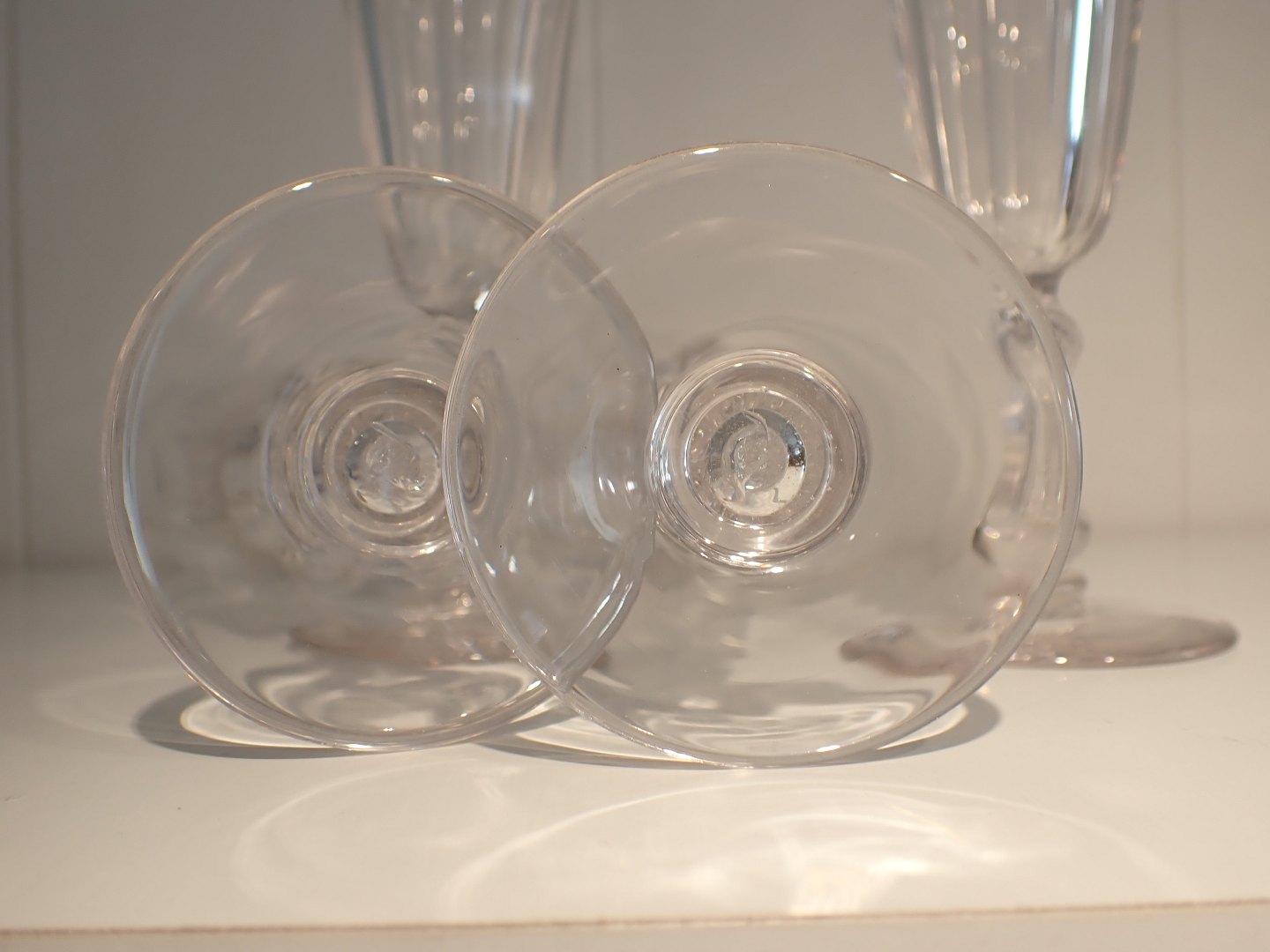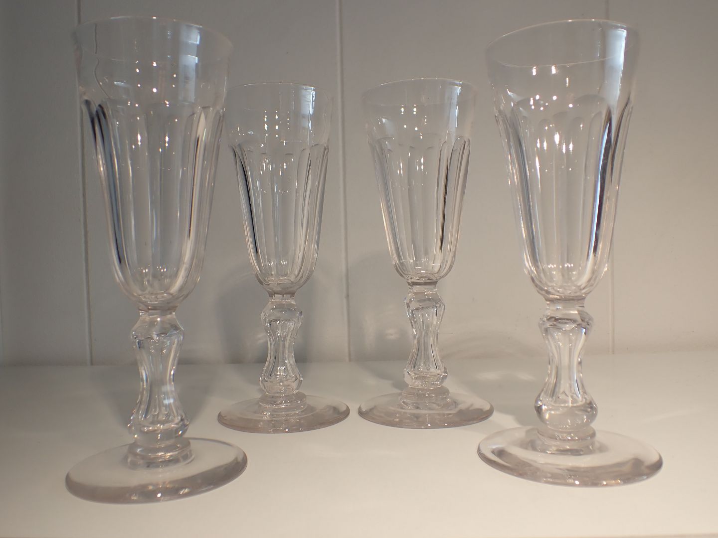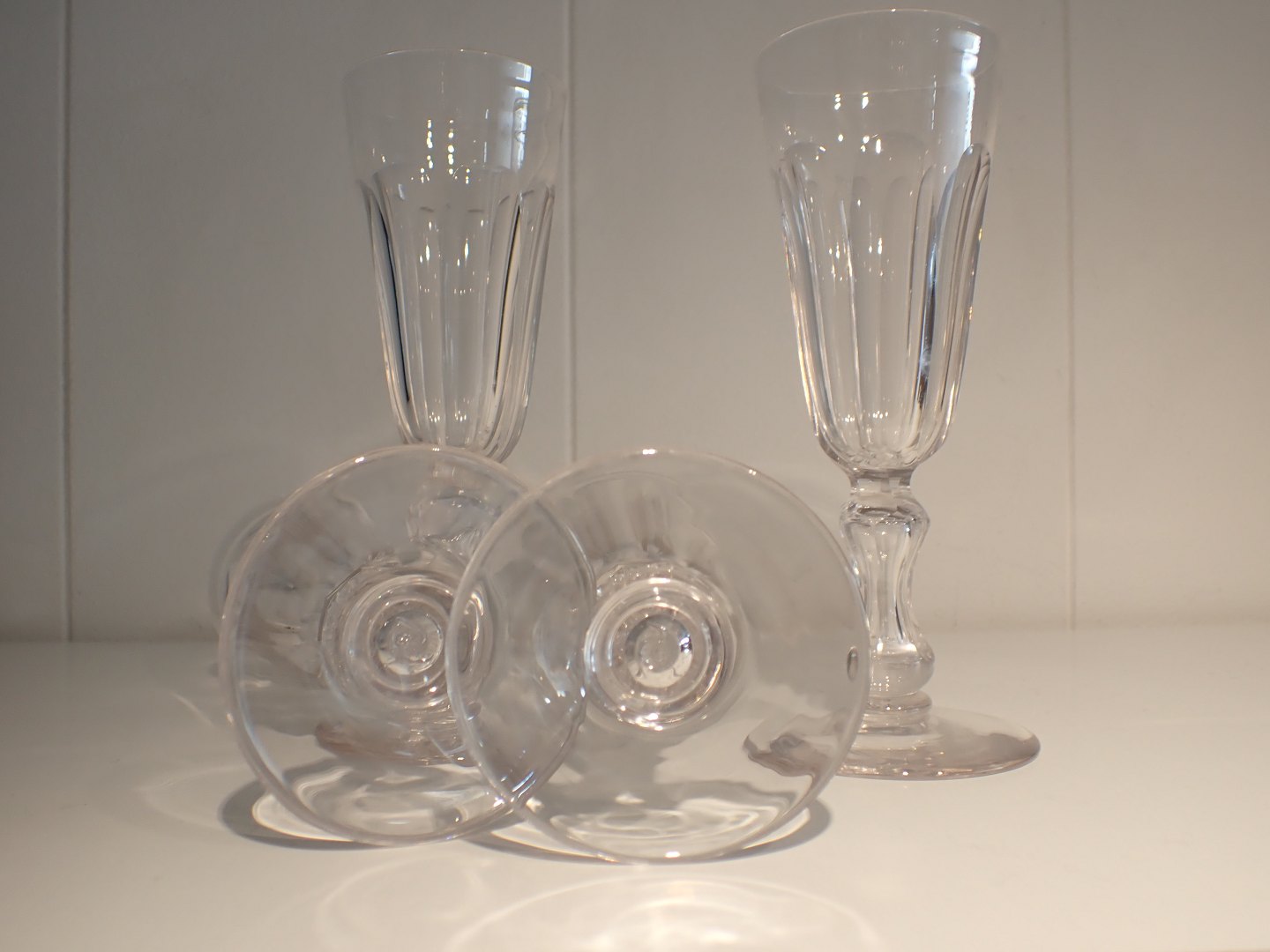 4 champagnefløjter belgisk type formentlig fra Holmegaard - krystal glas, kumme med store facetslibninger, omvendt ballusterstilk med luftlomme på flad rund fod. Ca. 1900. Højde 16,4 - 16,6 cm. I fin stand. Sælges kun samlet.