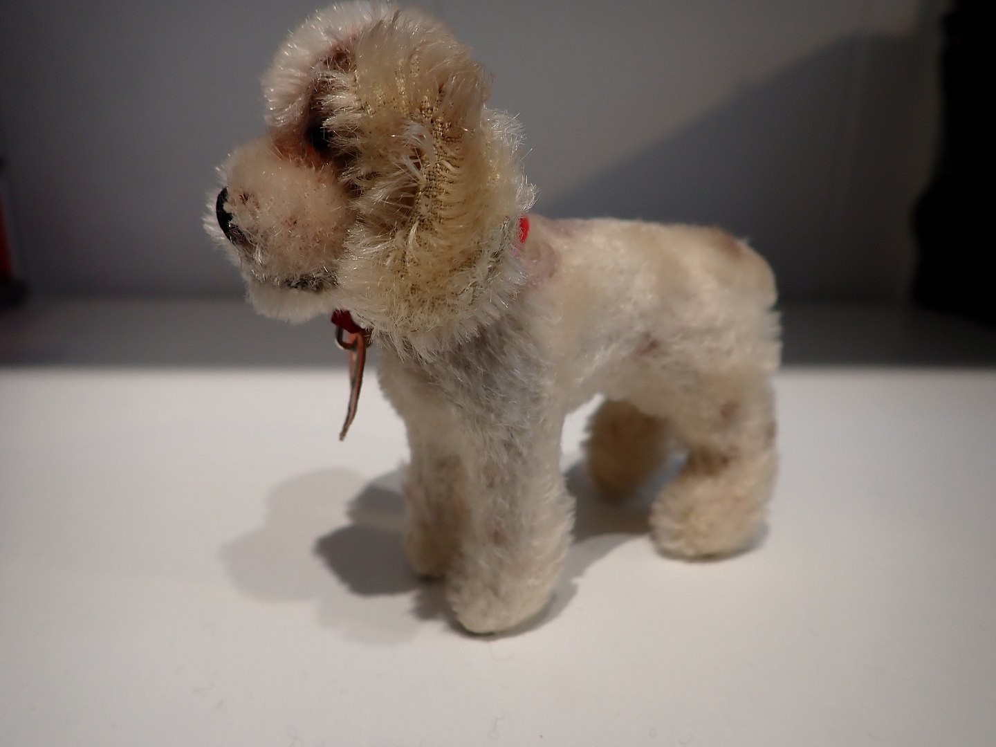 Til højre: Mini fox terrier med rødt halsbånd og Stieff mærke. Med glasøjne. Højde: 10 cm. Længde: 12 cm. I pæn stand med let slid. Pris: 485 kr.