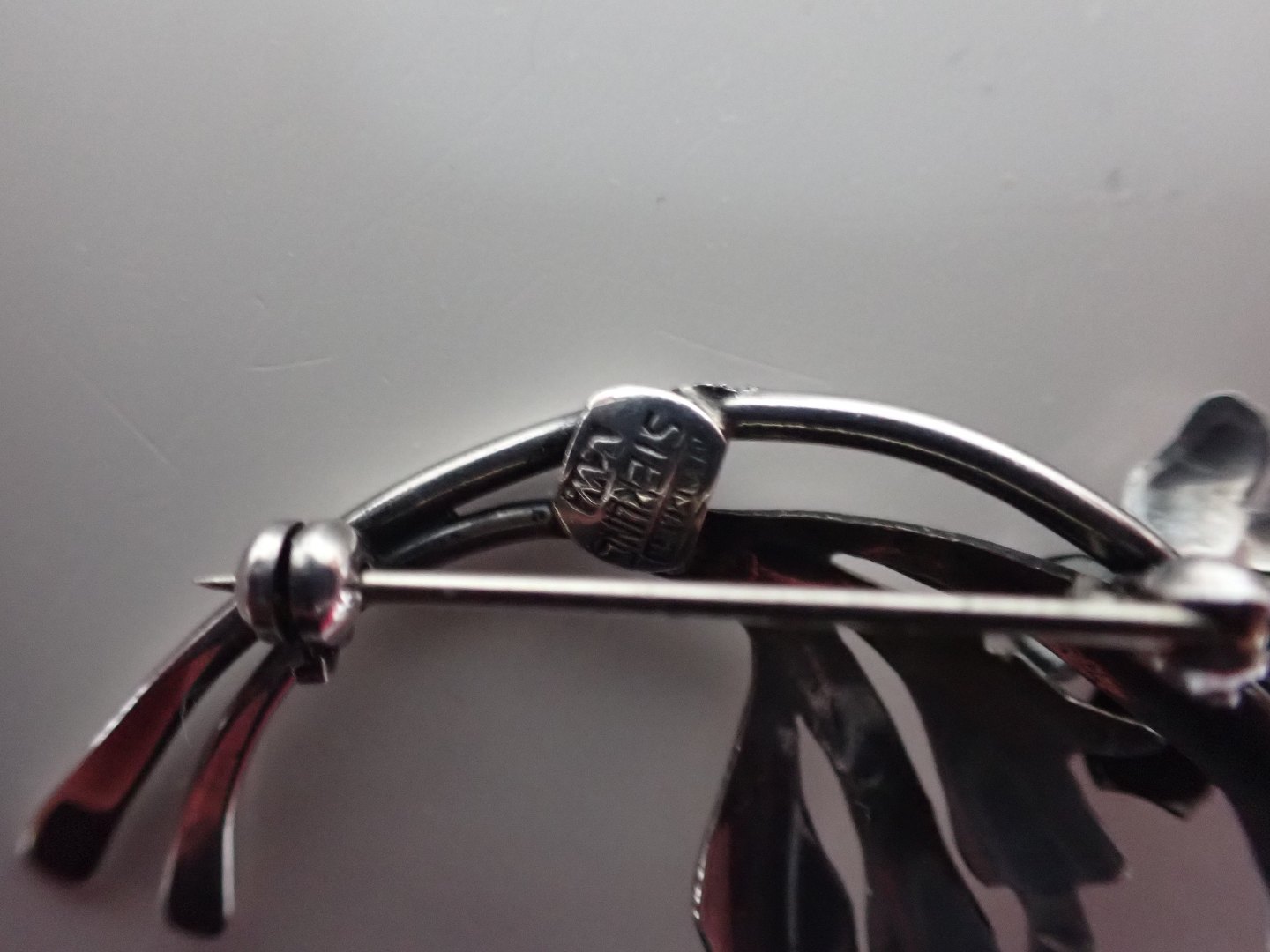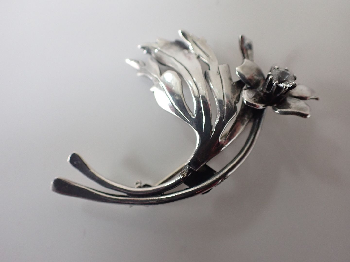 Viggo Wolny, Kbh.(1921 - 11973) - sterling sølvbroche i form af en blomst med facetsleben zikon. Stemplet Denmark, sterling, V.W. Ca. 1950. Vægt: 5,1 gram. Længde:4,5 cm. I fin stand.