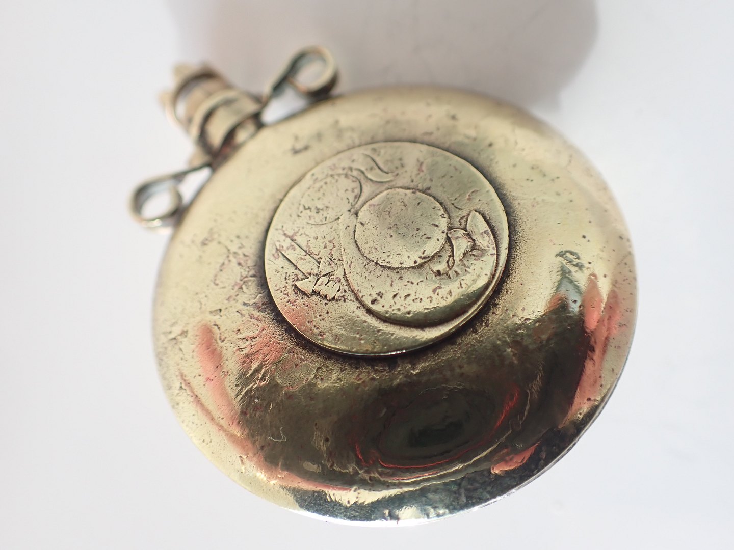 Til højre: Orientalsk parfumeflaske i messing med carbochonsleben agat indfattet i i sølv. Ca. 1900. Pris: 200 kr.