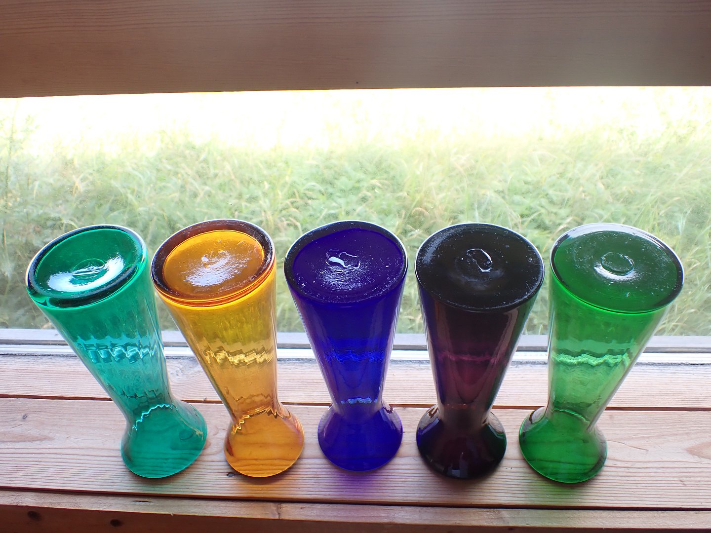 5 hyacintglas fra Holmegård. Sælges individuelt. Det grønne og auberginefarvede er solgt.