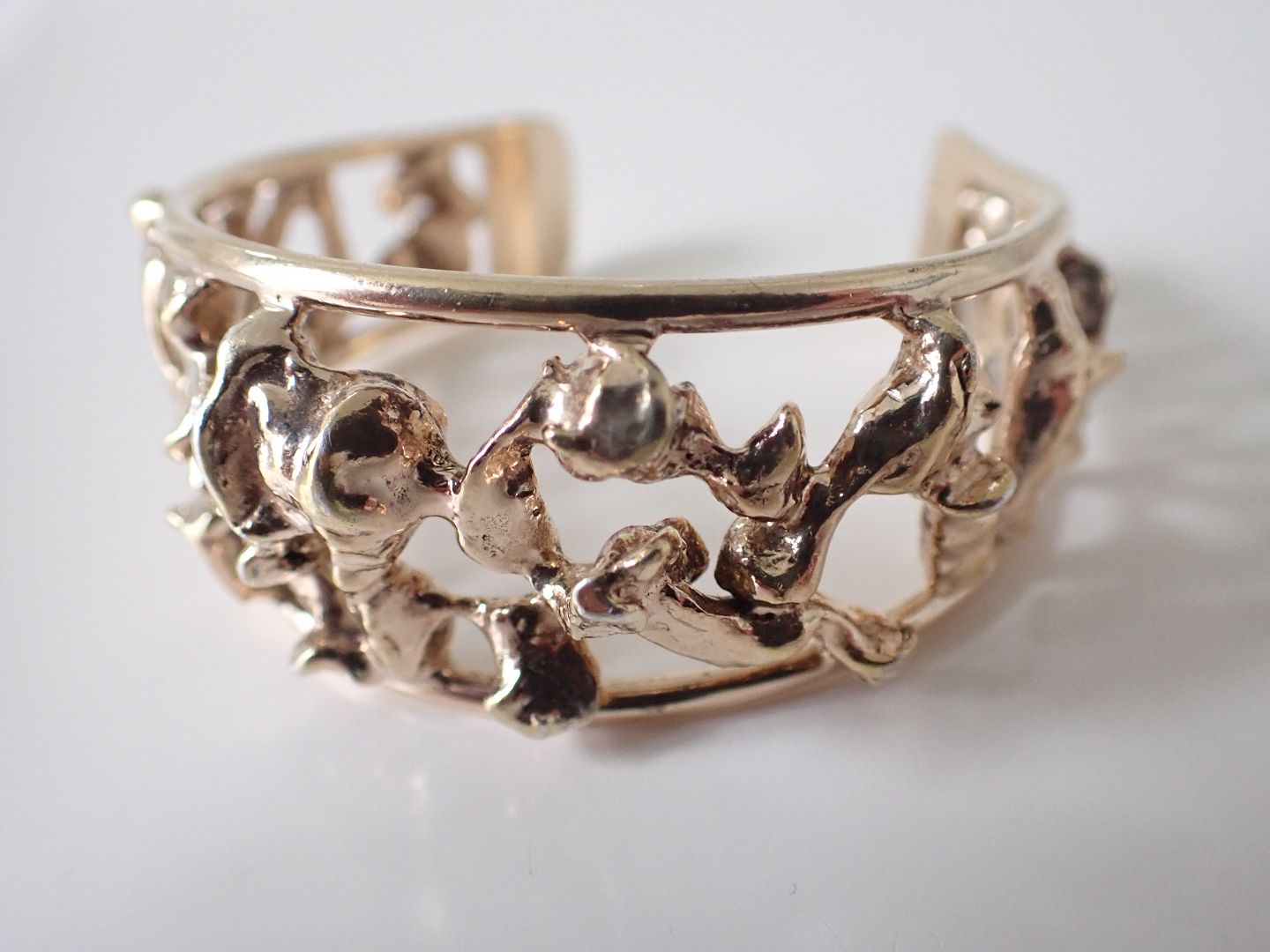 Aage Weimar (1902 - 1986) - åben armring i forgyldt sterling sølv med gennembrudt skulpturelt mønster. Stemplet Denmark, 925, AAW. Ca. 1960. Indvendig bredde: 5,5 cm. Bredde armbånd: 2,6 cm. Vægt: 61,5 gram. I pæn stand med meget lette brugsspor