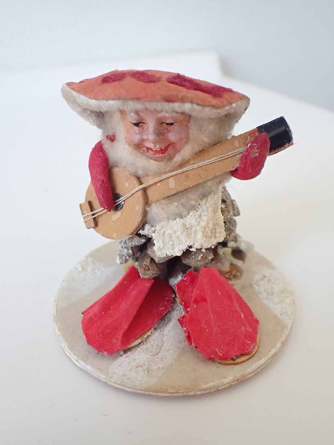 5 koglenisser med henholdsvis grangren, risengrød, piberensernisse, gavesæk, banjo og harmonika. Håndmalede, danske ca. 1930. Højde: 6,5 - 7,5 cm. I pæn tidstypisk stand.