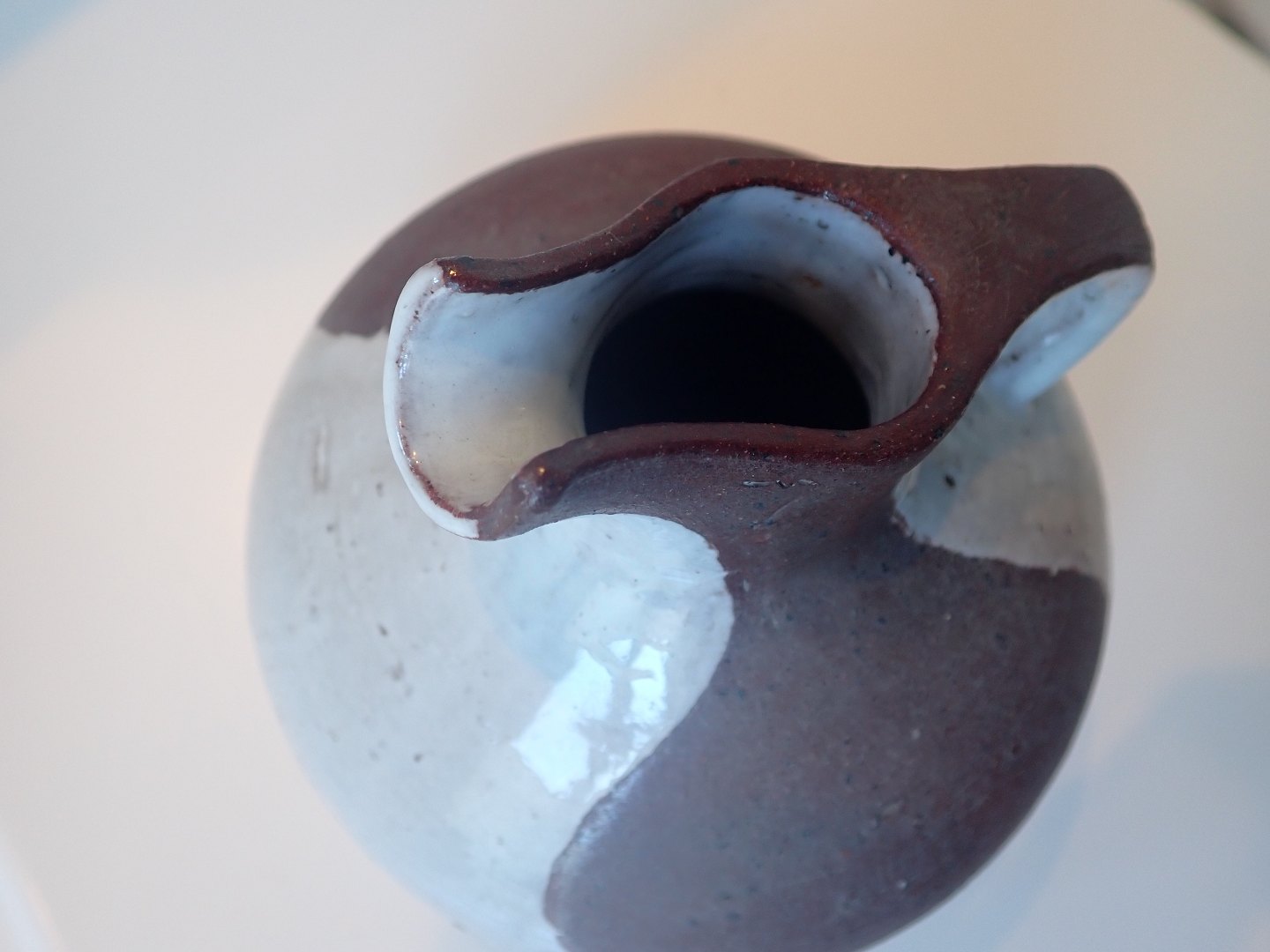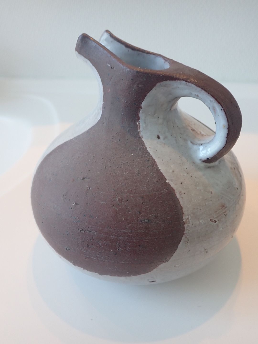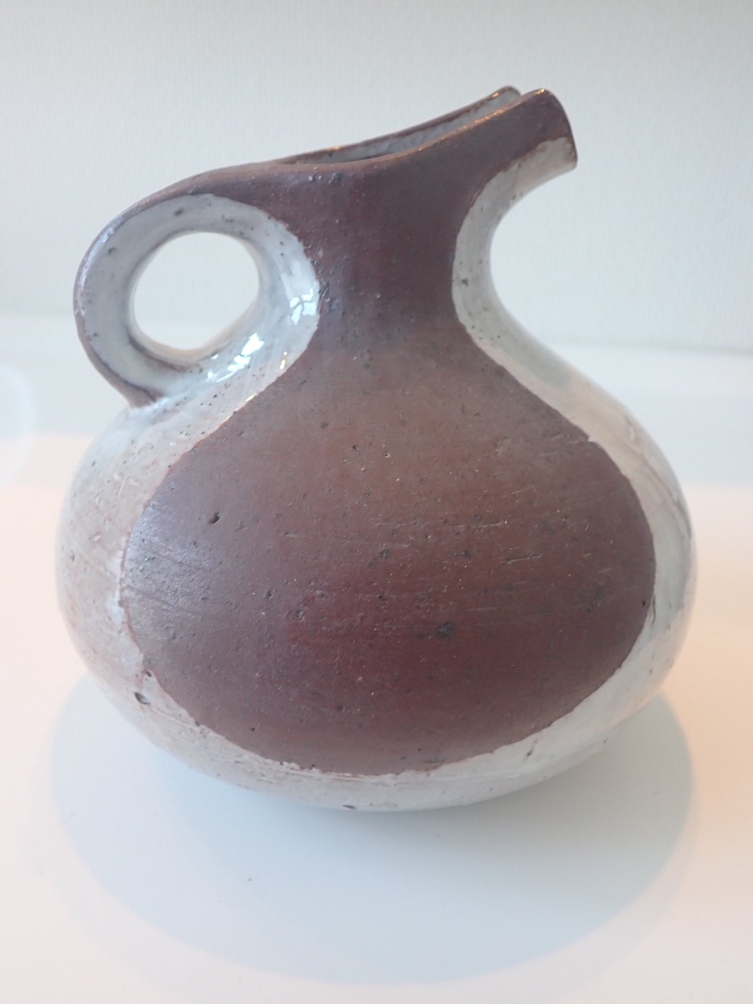 Gutte Eriksen (1918 - 2008) - spaltekande i hårdtbrændt ler med delvis, skulpturel glasering i lysegrå nuance. Ca. 1950. Højde: 14 cm. Bredeste bredde: 13,5 cm. I fin stand.