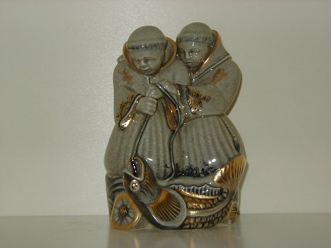 To Store Kongelige Figurer i Overglasur af Grønlænderpar. De har henholdsvis dekorationsnummer 12225 og 12224. DAMEN ER SOLGT. Begge er 1. sortering. Højde 34 cm. Begge er rigt og smukt dekoreret. Begge er i perfekt stand.